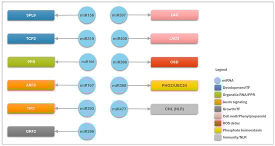 Schematic representation of A. stenosperma differentially expressed miRNA (DEM)–target interactions involved in the plant’s response to M. arenaria infection. Blue circles represent miRNAs, while colored squares indicate the functional categories of their target genes. Black arrows illustrate the regulatory relationships between miRNAs and their targets.