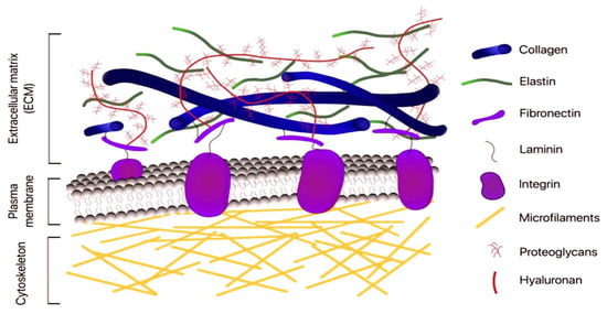 The extracellular matrix is a complex, organised 3D network that plays essential roles in tissue arrangement and remodelling, and in the modulation of cellular mechanisms [1,2]. It comprises collagens, proteoglycans (PGs), glycosaminoglycans (GAGs), elastin and elastic fibres, laminins, fibronectin, and additional structural and functional macromolecules, including matricellular proteins [1,2,3,4]. ECMs communicate between cells in organs and tissues, coordinating regulatory signals [1,2,5]. They guide tissue [3]. The processes of morphogenesis, development and homeostasis are interconnected and achieved through the regulation of growth, survival, differentiation and adhesion [4]. In pathological conditions, ECMs are susceptible to remodelling, acquiring a pivotal role in the advancement of the associated pathological process [5,6,7,8,9,10,11,12]. The arrangement of different ECM types is vital for many biological functions. Tissues (epithelial, nervous, muscle and connective) must be present in sufficient quantities to ensure effective functioning [13,14,15,16,17]. Nevertheless, ECM development is subject to constant adaptation in response to factors such as chemicals or the environment. The next section will discuss the mechanical signals that result in ECM remodelling [4,18]. Figure 1 shows the primary ECM networks and their constituent elements in different tissues.