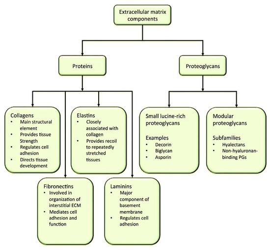 Figure 2. The ECM comprises two primary classes of biomacromolecules, namely proteins and proteoglycans. The ECM is composed of four primary protein types: collagen, fibronectin, elastin, and laminins. Notes: Notes: Proteoglycans represent a broad class of molecules that can be subdivided into three main subclasses: small lucine-rich proteoglycans, modular proteoglycans, and cell surface proteoglycans. It has been established that both classes of macromolecules play a crucial role in the structural and signalling processes.