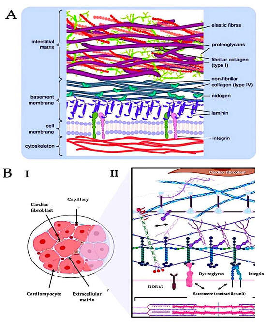 Figure 3. (A). The simplified extracellular matrix structure of a vascular system is defined as a three-dimensional macromolecular network composed of various proteins and polysaccharides. The pericellular matrix constitutes a layer in close proximity to the cells. Integrins bind to polymerised laminin, which, in turn, is connected via nidogen to the type IV collagen. Interstitial matrixes form a porous network comprising fibrillar collagens, elastic fibres, and proteoglycans. (B). (I) The basement membranes within the heart are of particular interest. The heart’s ECM comprises the BM and the interstitial matrix, which contains fibrillar collagens, such as collagen I and collagen III. The basement membrane (arrow blue) envelops the cardiomyocytes and microvasculature. Interspersed within the ECM are cardiac fibroblasts (arrow brown), which are responsible for the secretion of numerous matrix components. (II) A magnified view of the BM as an interface between the interstitial matrix and the sarcolemma of the cardiomyocyte is presented herewith. It has been established that a variety of BM components interact with the cardiomyocyte sarcolemma via integrin receptors, dystroglycan receptors and DDRs. Within the BM, laminin and collagen IV networks are organised in a complex manner, with perlecan and nidogen acting as ‘bridging molecules’ between these networks. Collagen XV and XVIII exhibit their characteristic polarisation, thereby establishing a linkage between the BM and the interstitial matrix. Collagen VI microfibrils interact with collagen IV, thereby establishing a physical linkage between the BM and the fibrillar components of the interstitial matrix. For the sake of comprehensibility, the lateral accumulation of collagen type IV is not displayed, and only a few illustrations of BM constituents and their interrelationships are provided. Refs. [1,2,3,17,20].