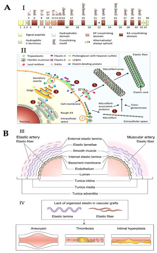 Figure 4. (A); (I), Schematic representation of the exon and domain structure of human TE. The numerical sequence is determined by exon assignment and serves to denote crosslinking domains (indicated by the numbers at the top; light and dark red squares) and hydrophobic domains (indicated by the numbers at the bottom; grey squares). Domains that have been subject to encoding by exons, and that are thus open to alternative splicing, are indicated by filled circles. The arrangement of sequence patterns within the eleven Lys-Ala and five Lys-Pro crosslinking domains is illustrated above the scheme. The width of the squares is proportionate to the respective domain sequence length. (II), The assembly of elastic fibres. (1) fibrillin and microfibril-associated proteins are secreted into the extracellular space, where they multimerise. The formation of the microfibrillar array is the subject of this study. (2) The process of TE synthesis occurs within the rough endoplasmic reticulum, where it becomes bound to the chaperone EBP. (3) It has been established that the EBP-TE complex is transported through the Golgi apparatus and subsequently secreted to the cell membrane. As a consequence of the interaction with GAGs, EBP dissociates. (4) Concurrently, TE is released from the chaperone and forms globules at the cell surface. Fibulin-4 plays a pivotal role in the alignment of the chain, a process that is critical for the mediation of the interplay with LOXs. The oxidation of Lys residues is followed by various condensation reactions, leading to the formation of covalent intra- and intermolecular cross-links. (5) Once a critical size has been attained by the cluster of TE molecules, it is then moved from the plasma membrane through the extracellular space. It is hypothesised that fibulin-5 directs the premature elastin to fibrillin microfibrils. (6) The elastin aggregates then fuse into larger assemblies with support by LTBP-4 and are subsequently further cross-linked. As the body undergoes various changes throughout the lifespan, elastin is subject to non-enzymatic processes and proteolytic cleavage. The latter process has been shown to result in the release of bioactive peptides, known as elastokines. (B); (III) The structural composition of the elastic and muscular arteries. It is an observable fact that both types of arteries are composed of tunica intima, tunica media, and tunica adventitia. In the case of elastic arteries, the tunica intima consists of the endothelium and a basement membrane that contains elastic fibres. The tunica media is composed of numerous continuous elastic lamellae, which are separated by thin layers of smooth muscle cells. The tunica media is delineated by the internal and external elastic lamina. The tunica adventitia comprises fibroblasts and elastic fibres. In the case of muscular arteries, the tunica media is characterised by the homogenous distribution of elastic fibres, which may be either scattered or discontinuous elastic lamellae. (IV) The absence of structured elastin within these elastic components is a pivotal element that contributes to the development of aneurysm, thrombosis, and intimal hyperplasia in vascular grafts. Abbreviations; EBP; Elastin Binding Protein; ER, Endoplasmic Reticulum; LTBP, Latent TGFb Binding Protein; PTMs, PostTranslational Modifications.