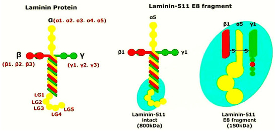 The laminin family comprises over 16 members, each with three chains. The distribution of laminin molecules exhibits specificity to tissue type and cellular origin. Laminin-111 is predominant in embryos, while laminins 521 and 511 are predominantly present in mature tissues. Laminins 211 and 221 demonstrate a more specific distribution. Laminins 211 and 221 have a more specific distribution. Laminins 411 and 421 have been detected in the basement membrane (BM) of endothelial cells, while laminin-332 has been found in the BM of the epithelium. In contrast, laminins 411 and 421 have been found in the BM of skeletal and cardiac muscles [74,75,76,77].