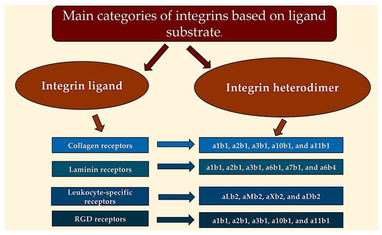 Integrins are transmembrane cell adhesion proteins that link the extracellular matrix and the cell cytoskeleton. They are vital to intracellular signalling pathways and their interaction with ECM proteins. Integrins form heterodimers between the alpha (α) and beta (β) subunits, with at least twenty-four unique combinations documented. Keciagia et al. [364] found that integrin subunit a-subunits comprise eighteen types and integrin subunit b-subunits eight types. Alpha- and beta-subunits are type I transmembrane proteins (TMEMs) with a large extracellular domain, a single transmembrane domain, and a short cytoplasmic region [364,365,366]. Harburger et al. [367] found that some subunits are present in greater quantities within a number of different heterodimers. For example, β1 is present in 12 heterodimers and av is present in 5. The extracellular region, notably the aI domain, is responsible for the provision of ligand specificity with ECM macromolecules or counter receptors located on adjacent cells.