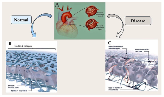 Figure 7. (A) Aortic valves exhibiting bicuspid morphology are indicative of aortic valve disease. The aortic media has elastic laminae that provide support and elasticity to the aorta. This is normal for the tricuspid valve (blue arrow). Valve patients (B) have fibrillin-1 microfibrils that attach smooth muscle. Cells are joined to the parts around them that are made of elastin and collagen. In patients with BAV (C) the body does not make enough of the microfibrillar elements that are needed. Smooth muscle cells detach, releasing enzymes called MMPs, which disrupt the matrix. (grey arrow) This leads to cell death and a loss of structural support and elasticity [406,407,408,409,410,412,413,414,415,416,417,418].