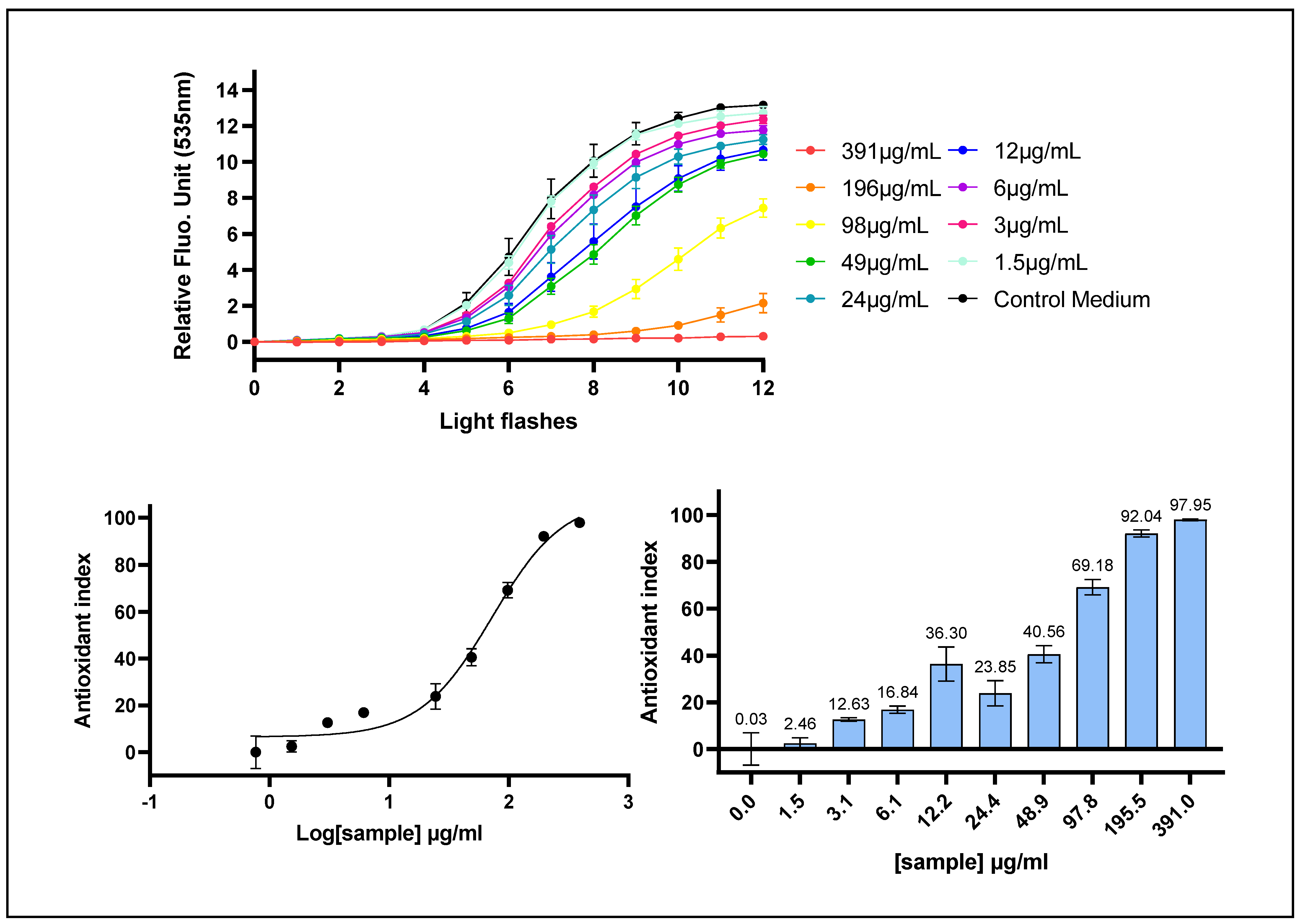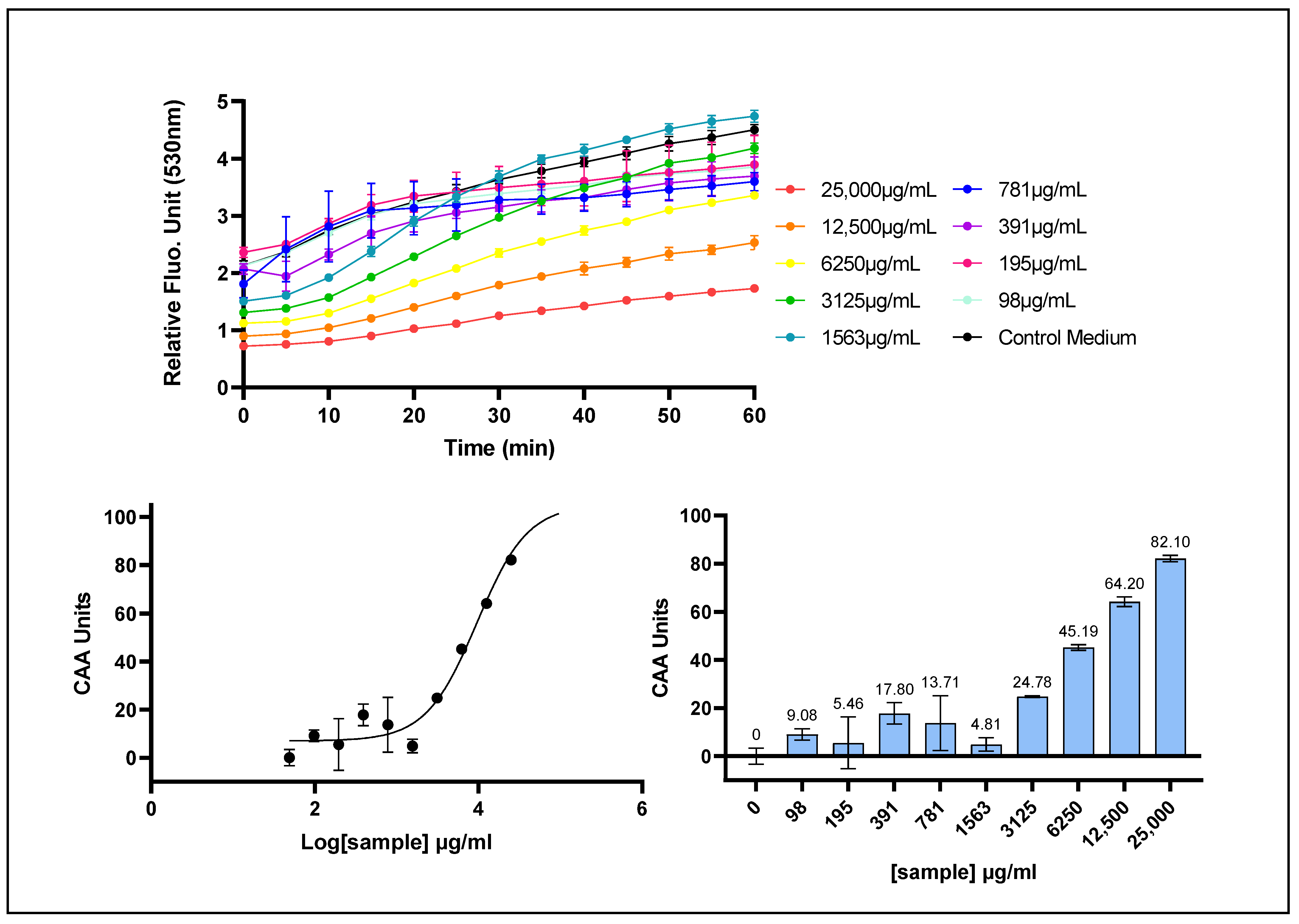 4.7. ROS Scavenging Activity at Cell Membrane with CAA Assay (AAPH/DCFH-DA)