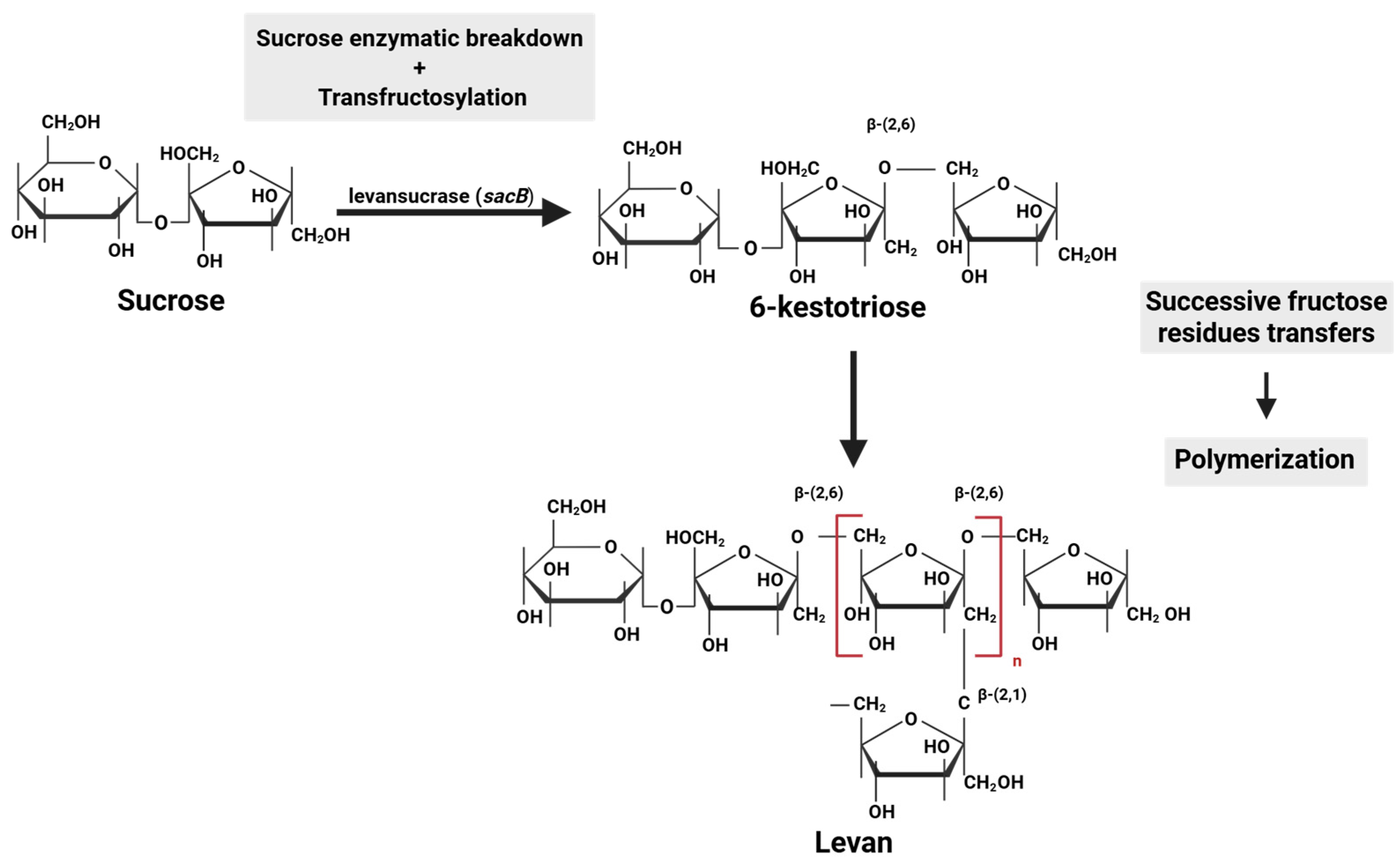 - Wang, S.; Wu, B.; Todhanakasem, T. Expanding the horizons of levan: From microbial biosynthesis to applications and advanced detection methods. World J. Microbiol. Biotechnol. 2024, 40, 214. [Google Scholar] [CrossRef]