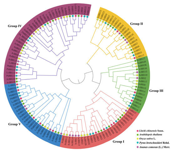 To elucidate the evolutionary relationships among the BBX genes of litchi, Arabidopsis, rice, pear, and pineapple, we constructed a phylogenetic tree using the BBX protein sequences from Arabidopsis (32), rice (30), pear (25), pineapple (19), and litchi (21). The cluster analysis revealed that the LcBBX genes could be classified into five distinct subfamilies (Group I–V), containing 4, 3, 2, 7, and 5 members, respectively. Previous studies have demonstrated that both AtBBX21 and AtBBX22 act as positive regulators of anthocyanin biosynthesis in Arabidopsis [23,24]. Among them, LcBBX8 clustered closely with AtBBX21, and LcBBX4 grouped with AtBBX22, suggesting that these BBX proteins may share a common evolutionary origin and could perform similar biological roles in litchi (Figure 1).
