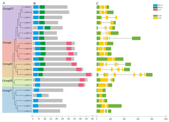Characterization of LcBBXs. (A) neighbor-joining tree analysis and its grouping of LcBBXs; (B) conserved structural domains of LcBBXs. The three conserved structural domains are represented by boxes of three colors; (C) gene structure of LcBBXs. Green and yellow boxes indicate UTR and CDS.