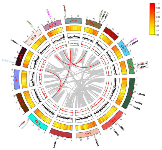 Intraspecific collinearity analysis of the LcBBX gene family members. The segmental duplicated gene pairs are linked by red lines, and the tandem duplicated gene pairs are marked with red dashed lines. The figure from outside to inside shows gene chromosome localization, gene density, genomic GC ratio, and genomic gap statistics.