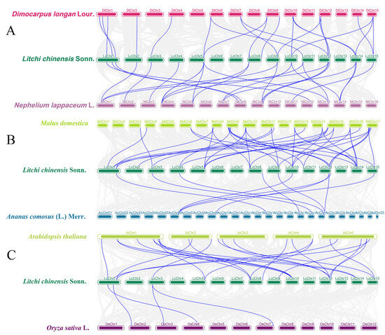 Collinearity analysis of the BBX gene family across multiple species. (A) Collinearity analysis between litchi, longan, and rambutan. (B) Collinearity analysis between litchi, apple, and pineapple. (C) Collinearity analysis between litchi, Arabidopsis, and rice. Gray lines represent the collinear within litchi and other plant genomes, blue lines emphasize the pairs of syntenic BBX genes.