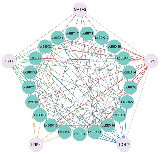 Protein–protein interaction network of LcBBX proteins. The circle represents LcBBXs, and the octagon represents genes that interact with LcBBXs. Each gene that interacts with LcBBX is connected using lines of different colors. The red lines indicate LcBBXs that interact with HY5; the green lines indicate that LcBBXs interact with HYH; the purple lines indicate that LcBBXs interact with GATA2.