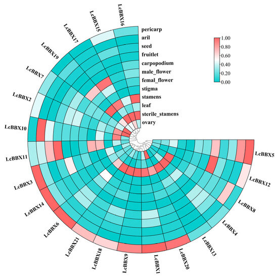 The expression profiles of litchi BBX genes in different tissues. A heatmap shows the relative expression levels in pericarp, aril (flesh), seed, fruitlet, carpopodium, male flower, female flower, stigma, stamens, leaf, sterile stamens, and ovary.