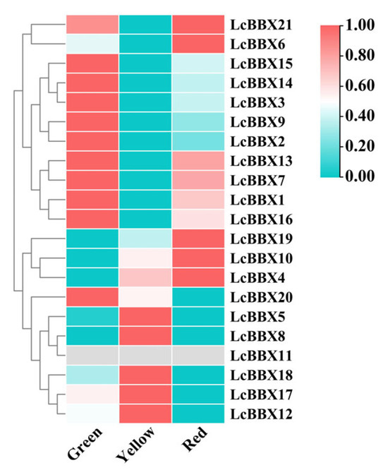 The expression profiles of LcBBX genes at different stages of pericarp coloring. The three developmental stages include green pericarp, yellow pericarp, and red pericarp.