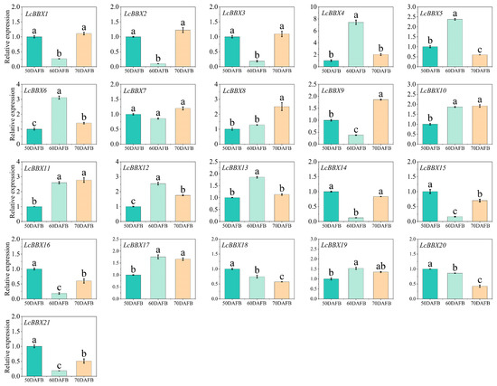 Expression patterns of LcBBX genes in different stages of pericarp development, namely the pre-coloration stage (50 DAFB), coloration stage (60 DAFB), and ripening stage (70 DAFB) of litchi pericarp. Data are means ± SEM of three biological replicates. Different letters mean significant differences at the 0.05 level.