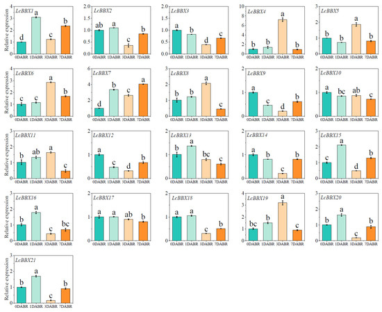 Expression patterns of LcBBX genes in litchi pericarp with the removal of shading treatment. DABR, days after bag removal. Data are means ± SEM of three biological replicates. Different letters mean significant differences at the 0.05 level.