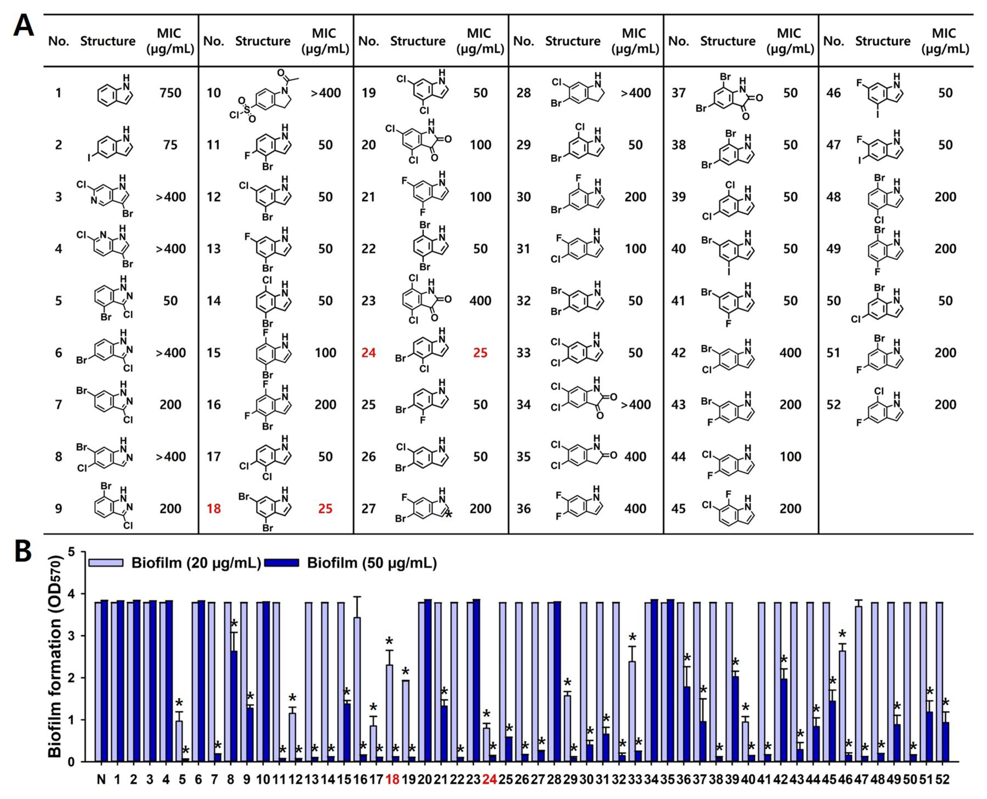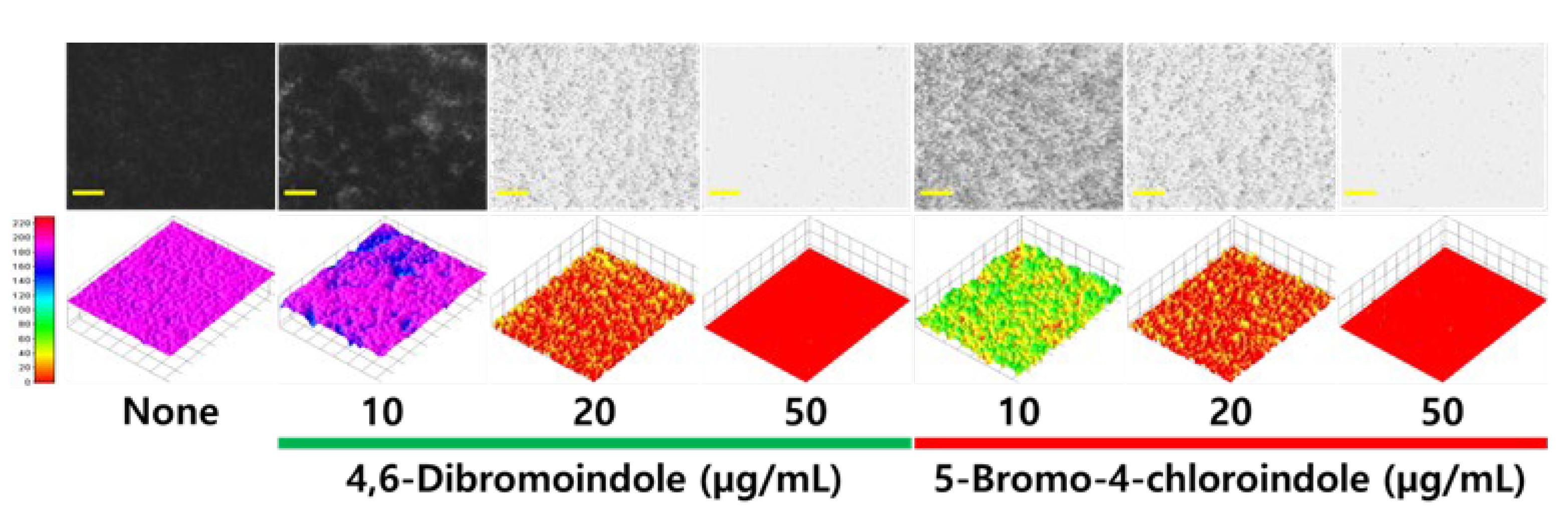 - Jeon, H.; Boya, B.R.; Kim, G.; Lee, J.-H.; Lee, J. Inhibitory effects of bromoindoles on Escherichia coli O157:H7 biofilms. Biotechnol. Bioprocess Eng. 2024, 29, 579–588. [Google Scholar] [CrossRef]