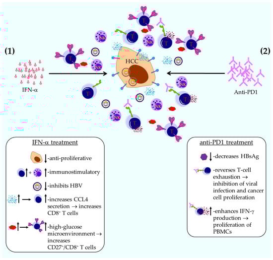 (1) The IFN-α treatment results in (a) an anti-proliferative effect on tumor cells; (b) an immunostimulatory effect on NK and T cells; (c) inhibition of HBV; (d) an increase in CCL4 secretion by tumor cells, resulting in the attraction of CD8+ T cells to the TME, the activity of which is increased by the anti-PD1 treatment; and (e) a high-glucose microenvironment, which results in an increase in CD27+/CD8+ T effector cells, the activity of which is again increased by the anti-PD1 treatment (Figure 2 and []). (2) The anti-PD1 treatment results in (a) a decrease in hepatitis B surface antigen (HBsAg), (b) a reversal of T-cell exhaustion, which inhibits viral infection and cancer cell proliferation; and (c) an enhancement in IFN-γ secretion, causing the proliferation and activation of surrounding PBMCs (Figure 2 and []).