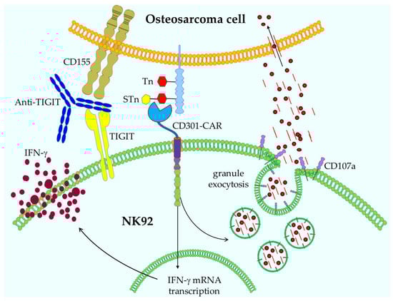 Schematic representation of the functionality of CD301-CAR NK92 cells. After recognition of STn or Tn antigens on osteosarcoma cells by CD301-CAR, the NK92 cells respond with exocytosis of granules loaded with perforin and granzyme B and IFN-γ secretion, thereby killing the tumor cells. Tumor cell lysis can be enhanced by ICI with anti-TIGIT antibodies. Not depicted: the intrinsic lytic mechanisms of NK cells. This figure was created with Motifolio.