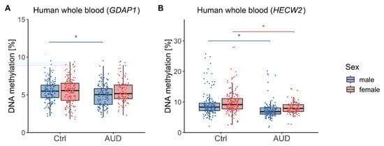 Human whole blood DNA methylation in AUD patients and control participants. DNA methylation distributions in male and female participants within the GDAP1 gene promoter region (A) and HECW2 intragenic region (B). Asterisks indicate statistically significant differences. Ctrl: controls, AUD: alcohol use disorder.