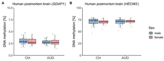 Human postmortem brain DNA methylation in AUD patients and control participants (replication cohort). DNA methylation distributions in male and female participants within the GDAP1 gene promoter region (A) and HECW2 intragenic region (B). Ctrl: controls, AUD: alcohol use disorder.