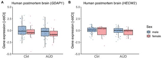 Human postmortem brain gene expression in AUD patients and control participants (replication cohort). Gene expression distributions in male and female participants within the GDAP1 (A) and HECW2 gene (B). Ctrl: controls, AUD: alcohol use disorder.