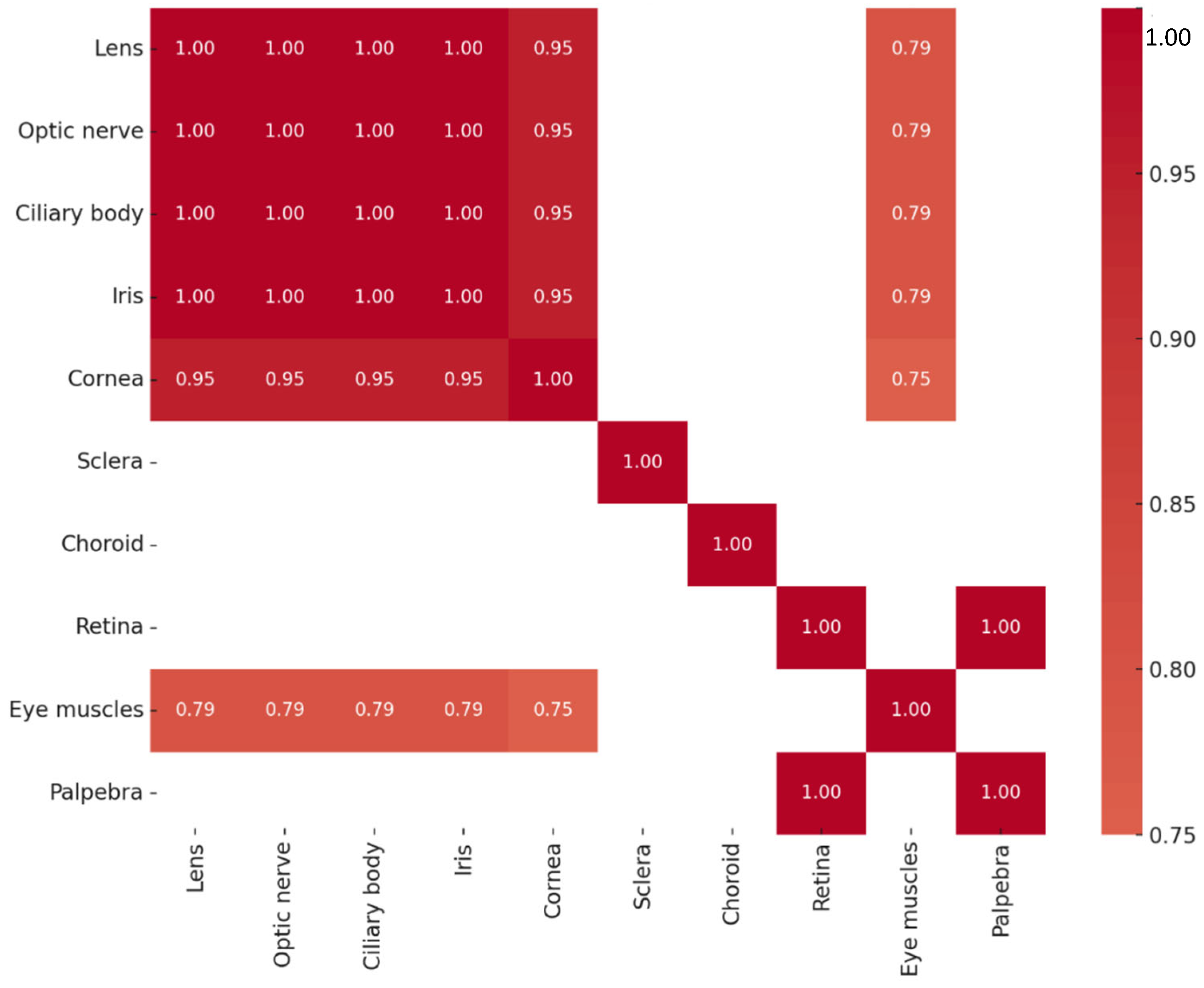 Correlation analysis revealed strong interrelationships in Pax6 protein expression across ocular tissues. Perfect correlations were found between the lens, optic nerve, ciliary body, and iris, as well as between the retina and eyelid. Strong associations were also seen between the cornea and extraocular muscles. Such patterns suggest coordinated Pax6 activity among tissues, reflecting shared developmental pathways and its role as an integrator of ocular morphogenesis [
