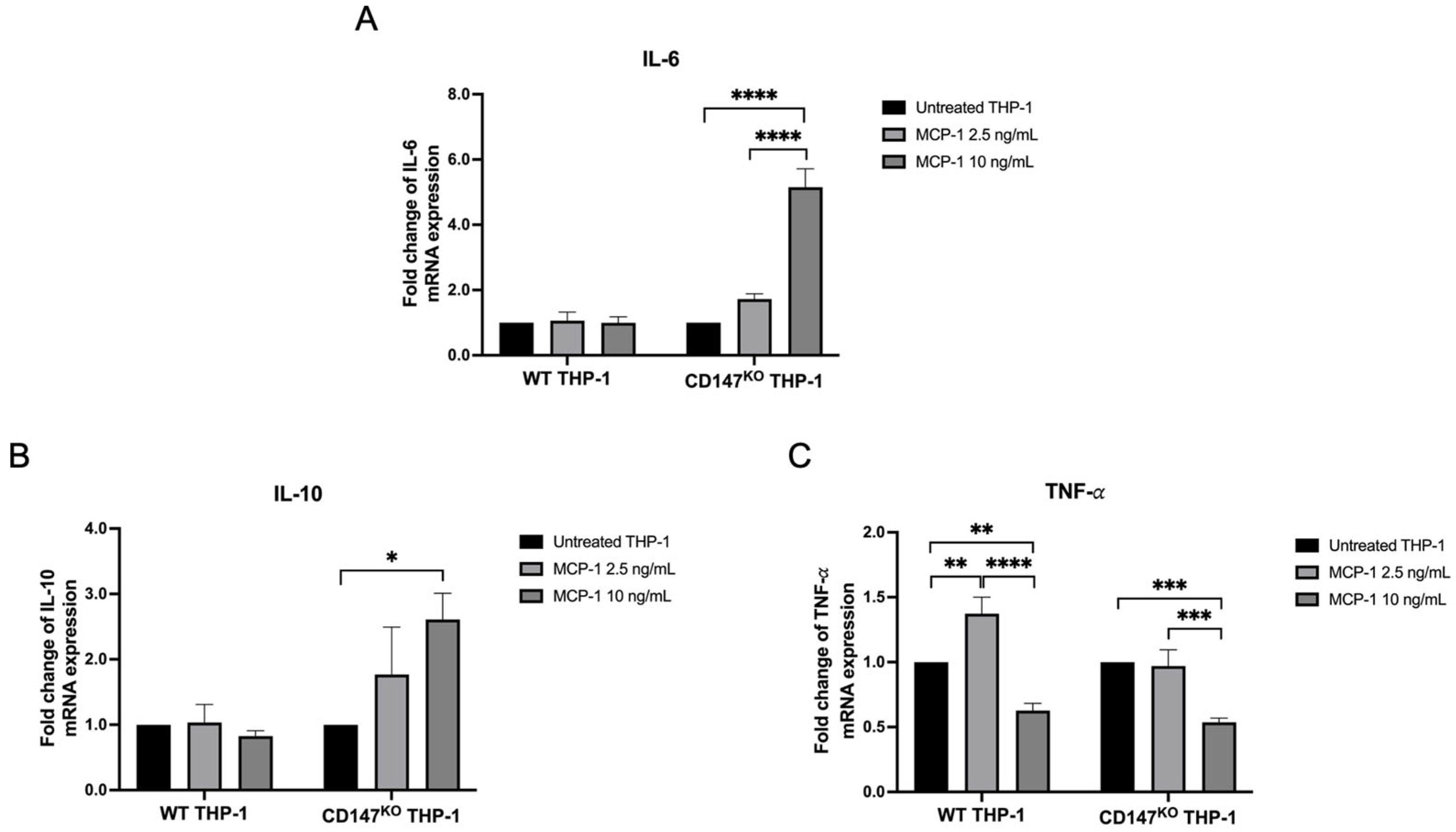 2.6. Inflammatory Cytokine Gene Expression on WT and CD147KO THP-1 Monocytes