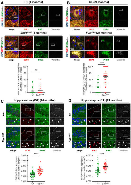 Our research on Chchd10S59L/+ mice demonstrated that SLP2 and PHB aggregates accumulate in degenerating spinal MNs and hippocampal neurons, correlating with neuronal loss [10,15]. This led us to investigate whether these aggregates are exclusive to CHCHD10-associated disease or found in ALS of other origins. To this end, we analyzed SLP2/PHB aggregates in two ALS mouse models: Sod1G86R, which exhibits a severe form as early as 4 months of age [22,23], and FusΔNLS, which develops a late-onset disease with symptoms at 24 months of age [24,25]. Contrary to our results in Chchd10S59L/+ mice at the end-stage (around one year of age) [15], immunostaining for SLP2 and PHB2 did not reveal any abnormal expression in the spinal MNs of Sod1G86R mice at end-stage (4 months) (Figure 1A). However, large perinuclear aggregates expressing both SLP2 and PHB2 were observed in spinal MNs of FusΔNLS mice at 24 months of age (Figure 1B). These aggregates were also positive for vimentin, consistent with their aggresome-related nature. Quantitative analysis confirmed a significant increase in the proportion of MNs containing SLP2/PHB aggregates in FusΔNLS mice compared to controls. Furthermore, significant SLP2 and PHB2 aggregation was detected in FusΔNLS mice hippocampus (Figure 1C,D), mirroring the patterns observed in Chchd10S59L/+ mice [15].