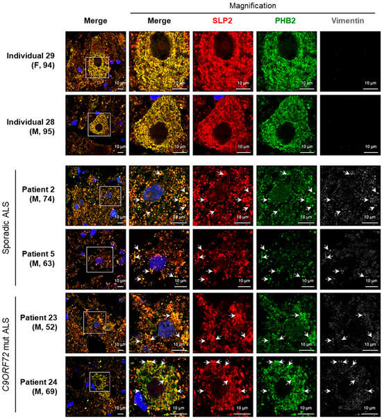 SLP2/PHB aggregates in spinal motor neurons of ALS patients. Representative spinal cord sections from two control individuals (29 and 28, aged 94 and 95 years), two sporadic ALS patients (2 and 5, aged 74 and 63 years), and two C9ORF72-associated ALS patients (23 and 24, aged 52 and 69 years). Sections were immunostained with antibodies against SLP2 (red), PHB2 (green), and Vimentin (gray), DAPI (blue). Arrows indicate colocalized SLP2/PHB aggregates. Scale bar = 10 µm. F = female; M = male.