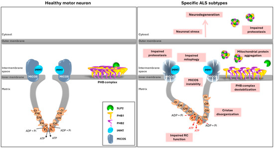 Proposed model of SLP2/PHB aggregation in ALS pathogenesis (adapted from [15]). Schematic representation illustrating how SLP2/PHB aggregation may contribute to ALS. In healthy MNs, SLP2 and PHB complex support, at least in part, mitochondrial homeostasis by maintaining cristae organization, respiratory chain (RC) integrity, and efficient mitophagy. In specific ALS subtypes (e.g., CHCHD10, FUS or C9ORF72 mutations), destabilization of the PHB complex and/or MICOS disorganization may promote the formation of SLP2/PHB aggregates within mitochondria. These aggregates disrupt mitochondrial architecture and function, leading to defective mitophagy, impaired proteostasis, accumulation of cytoplasmic aggregates, and ultimately to neuronal stress and neurodegeneration.