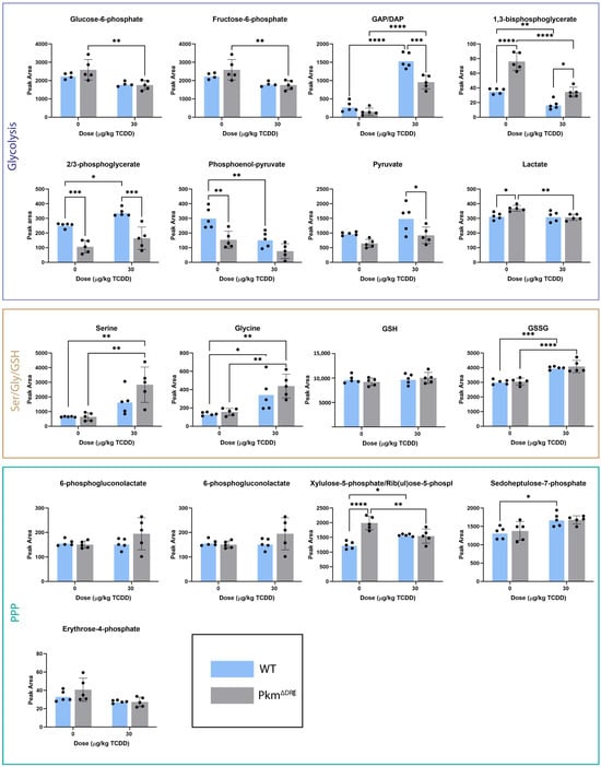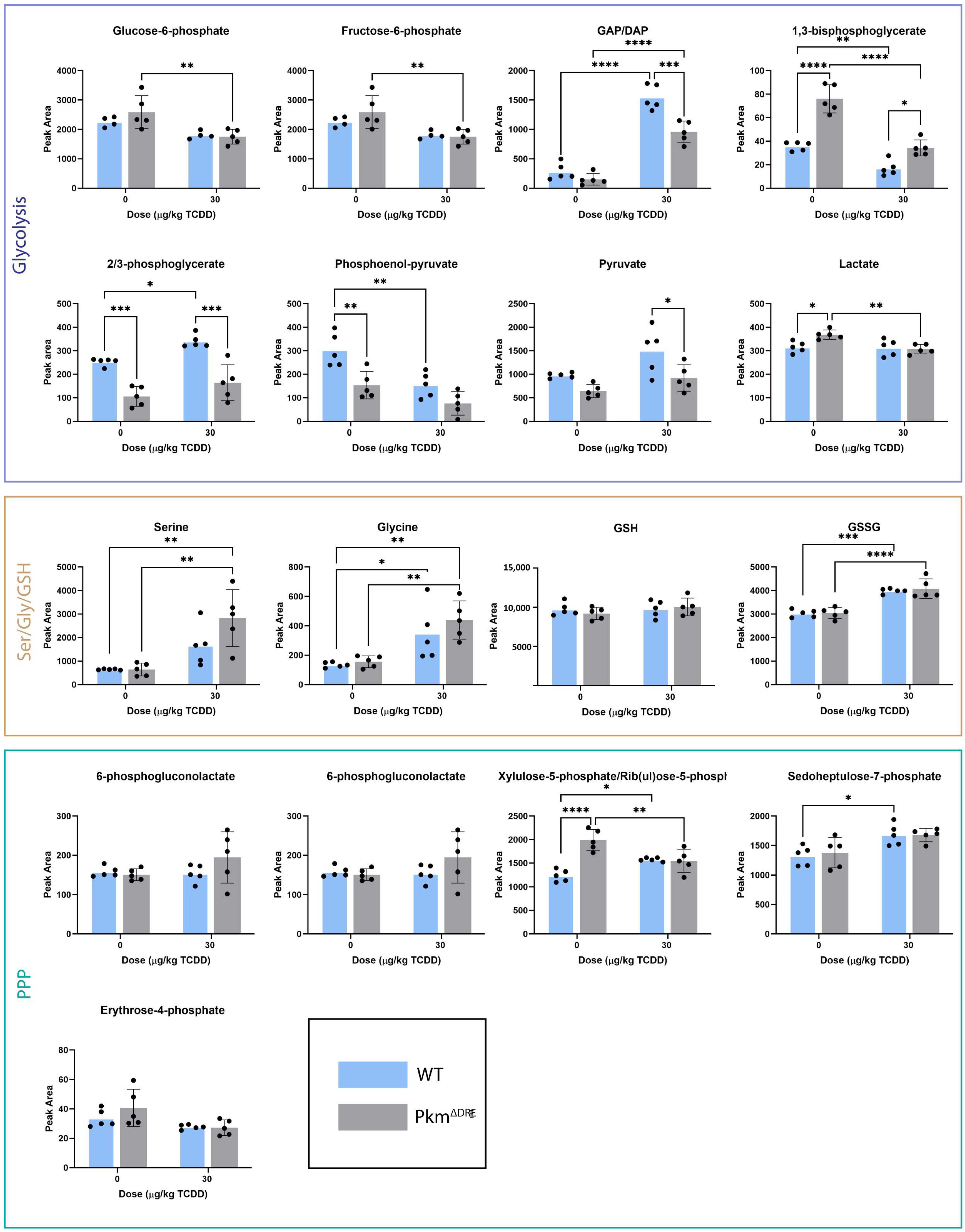 Levels of glycolytic, Ser/Gly/GSH and PPP metabolites. WT and PkmΔDRE mice were treated with sesame oil (vehicle) or 30 µg/kg TCDD every 4 day for 28 days. Livers were snap-frozen, and metabolites were extracted using 80% methanol. Samples were analyzed on a Xevo G2-XS Quadrupole Time of Flight mass spectrometer attached to a Waters Acquity UPLC (Waters) operated in negative-mode electrospray ionization. Peak areas were quantified using MassLynx software V4.2. Bars represent mean ± SD. Asterisk indicates significance (* p ≤ 0.05, ** p < 0.01, *** p ≤ 0.001, **** p ≤ 0.0001) determined by two-way ANOVA and Tukey’s post hoc test (n = 5).