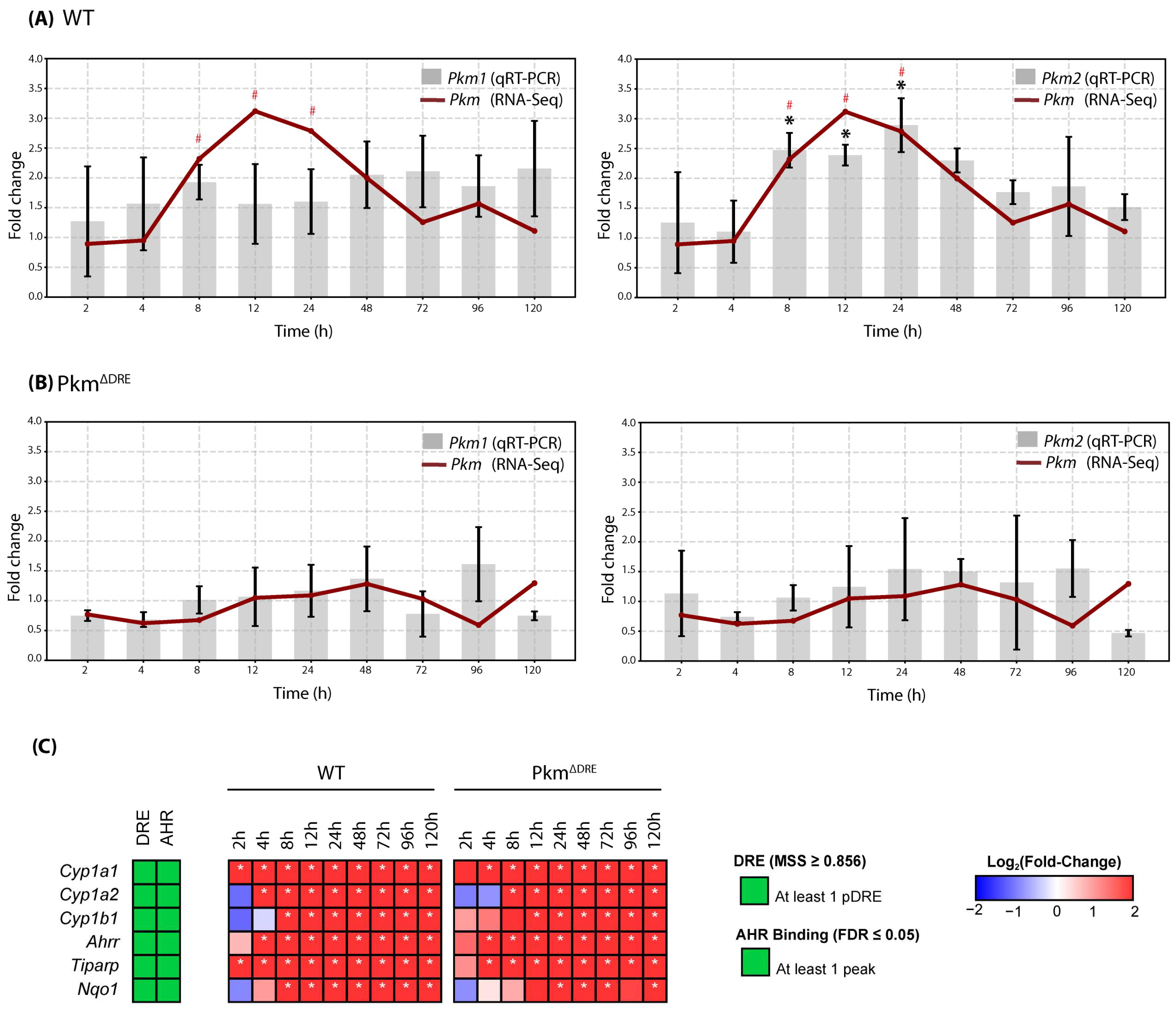 Pkm2 induction by TCDD in WT and PkmΔDRE primary hepatocytes. Pkm expression was assessed by RNA-Seq (presented as red line graph) and qRT-PCR (presented as bar graph) in (A) WT and (B) PkmΔDRE mouse hepatocytes treated with DMSO (vehicle) or 10 nM TCDD for 2, 4, 8, 12, 24, 48, 72, 96 and 120 h. Bars represent mean ± SD. Asterisk (qRT-PCR) or pound sign (RNA-Seq) indicates p ≤ 0.05 in fold change as determined by a two-way ANOVA and Tukey’s post hoc test. (C) Effect of TCDD on AhR battery genes. The presence of dioxin response elements (DRE) within the gene loci and in vivo AHR genomic enrichment at 2 h, following TCDD exposure (green). Color scale represents the log2 (fold change) for differential gene expression determined by RNA-Seq analysis (n = 5). The asterisk indicates differential expression with a posterior probability (P1 (t)) ≥ 0.80.
