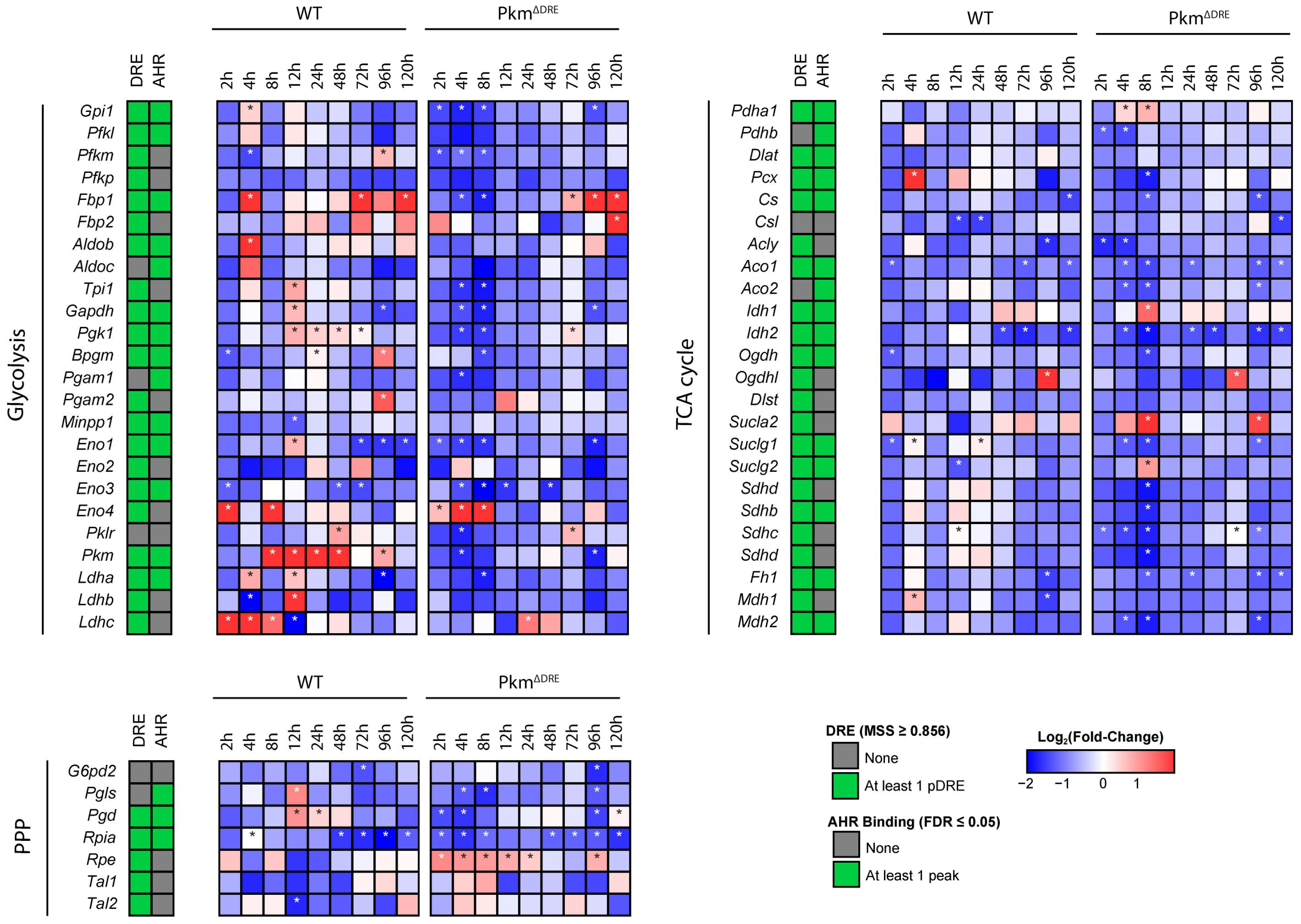 Effect of TCDD on glycolysis, PPP and TCA cycle gene expression. The presence of putative dioxin response elements (pDRE) within the gene loci and in vivo hepatic AHR genomic enrichment at 2 h, following TCDD treatment (green). Time-dependent gene expression was assessed in wild type (WT) and PkmΔDRE primary mouse hepatocytes treated with DMSO (vehicle) or 10 nM TCDD for 2, 4, 8, 12, 24, 48, 72, 96 and 120 h. Color scale represents the log2 (fold change) for differential gene expression determined by RNA-Seq analysis (n = 5). The asterisk indicates differential expression with a posterior probability (P1 (t)) ≥ 0.80.
