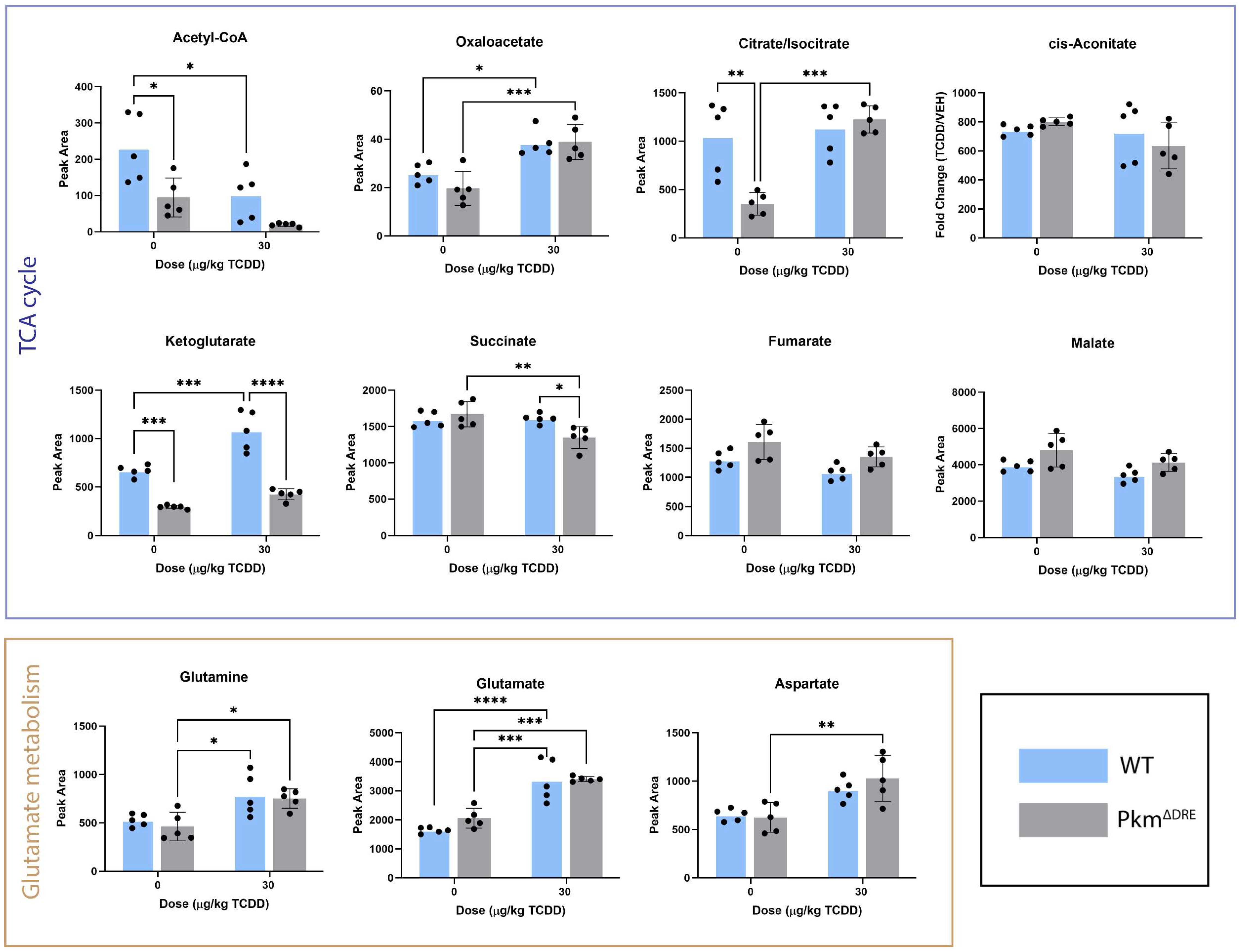 Finally, glutamine, glutamate and aspartate levels were all increased in PkmΔDRE liver extracts, whereas only glutamate was elevated in WT (Figure 5). These changes in PkmΔDRE liver extracts provides further support that the loss of PKM2 expression not only affects gene expression but also reprograms central carbon metabolism in response to TCDD treatment.