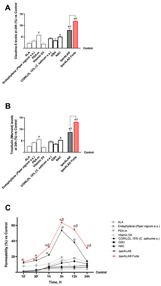 Results obtained after treatment with the test samples at the level of a 3D in vitro model of the BBB. (A) Claudin-5 levels obtained by an ELISA kit at 24 h; (B) marveld (or tricelluline) levels obtained by an ELISA kit at 24 h; (C) permeability rate examined by a fluorescent probe. Data are expressed as mean ± SD (%) of 5 independent experiments performed in triplicate, normalised to the control (0% line) to highlight treatment-related changes. Positive values indicate increases relative to the control. For (A,B): * p < 0.05 vs. control; α p < 0.05 vs. single agents; the bar indicates p < 0.05 vs. IperALA®. For (C): α p < 0.05 vs. single agents; β p < 0.05 vs. IperALA®.