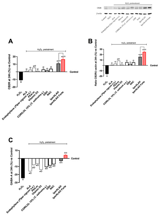 Results obtained on biological markers related to neuroinflammation pathways and the context of nociception, after treatment for 24 h with test samples at the level of an in vitro brain organoid model under conditions of pre-treatment with H2O2 200 μM. (A) CB2R levels obtained by an ELISA kit at 24 h; (B) CB2R densitometric analysis after Western Blot, which is reported as an example image; (C) GABA levels obtained by ELISA kit at 24 h. Data are expressed as mean ± SD (%) of 5 independent experiments performed in triplicate, normalised to the control (0% line) to highlight treatment-related changes. Positive and negative values indicate increases or decreases, respectively, relative to the control. * p < 0.05 vs. control; φ p < 0.05 vs. H2O2 200 μM; α p < 0.05 vs. single agents; the bar indicates p < 0.05 vs. IperALA®.