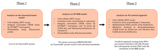The first phase of the study focused on analysing the effects of the individual agents, the commercial product, and the new formulation at the level of an in vitro intestinal barrier model on the Food and Drug Administration (FDA) and European Medicines Agency (EMA)-approved Transwell® system. Specifically, after treatment for 1 h to 6 h, analyses were performed on the maintenance of cell viability by the MTT assay to avert any cytotoxic effects at the intestinal level. Accurate measurement of TEER by an EVOM3™ instrument was essential at this level; this was to study the maintenance of intestinal barrier integrity status. Finally, during the 1 h–6 h treatment period, the permeation status along the intestinal barrier of the various samples under examination was studied by a fluorescent probe. Then the intestinal metabolites from each test sample present at the level of the lower or basolateral compartment of the Transwell® system were collected. This allowed the peripheral blood to be repurposed in vitro and contained specifically the intestinal metabolites and the substances that correctly crossed the intact epithelium. The supernatant was used as a stimulus for its subsequent cellular target following the correct physiological process after intestinal assimilation. The intestinal metabolites from each sample, contained at the level of the lower or basolateral compartment of the Transwell® system, were collected and used as a stimulus for the next phase with the BBB model (Phase 2).