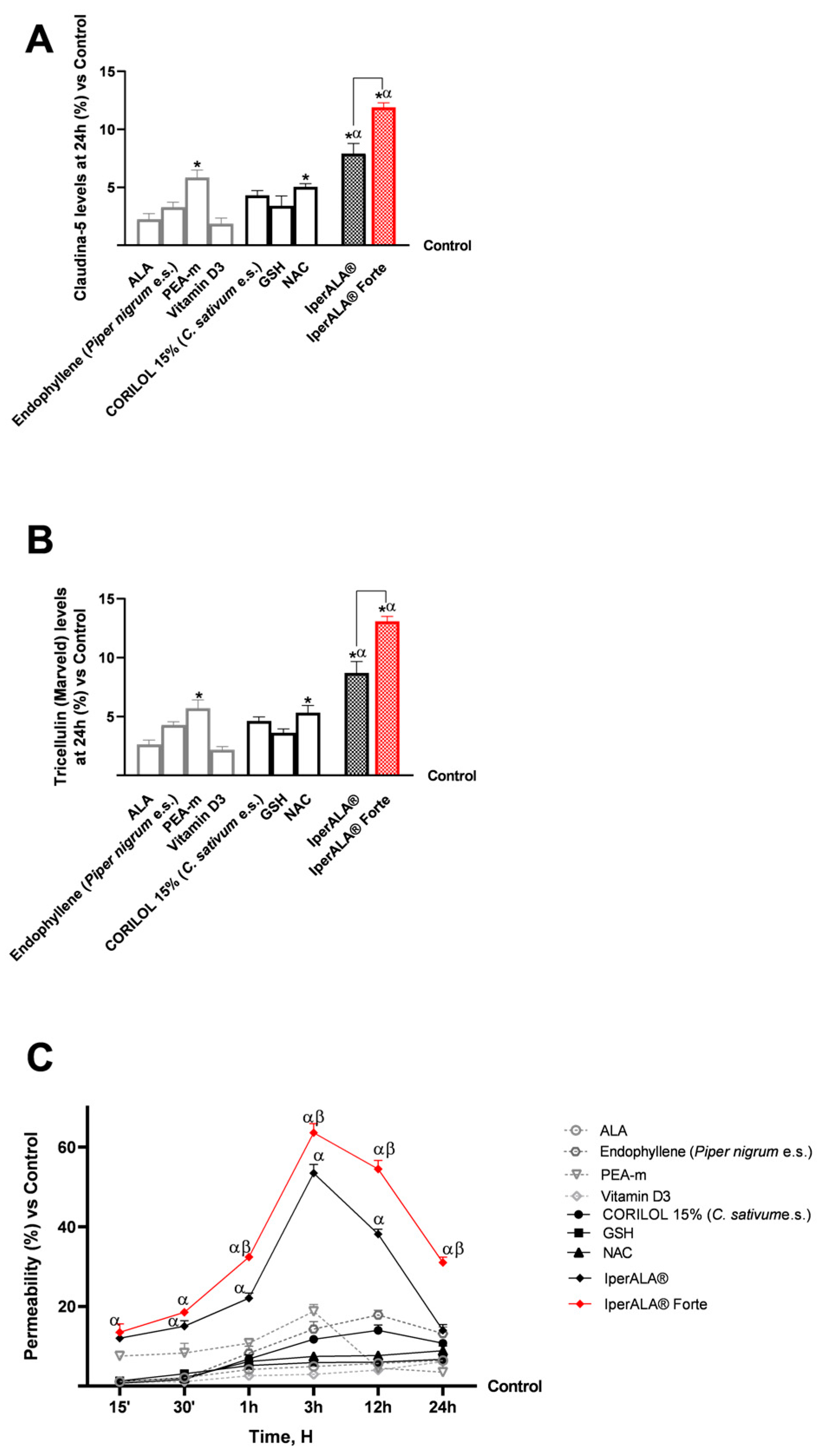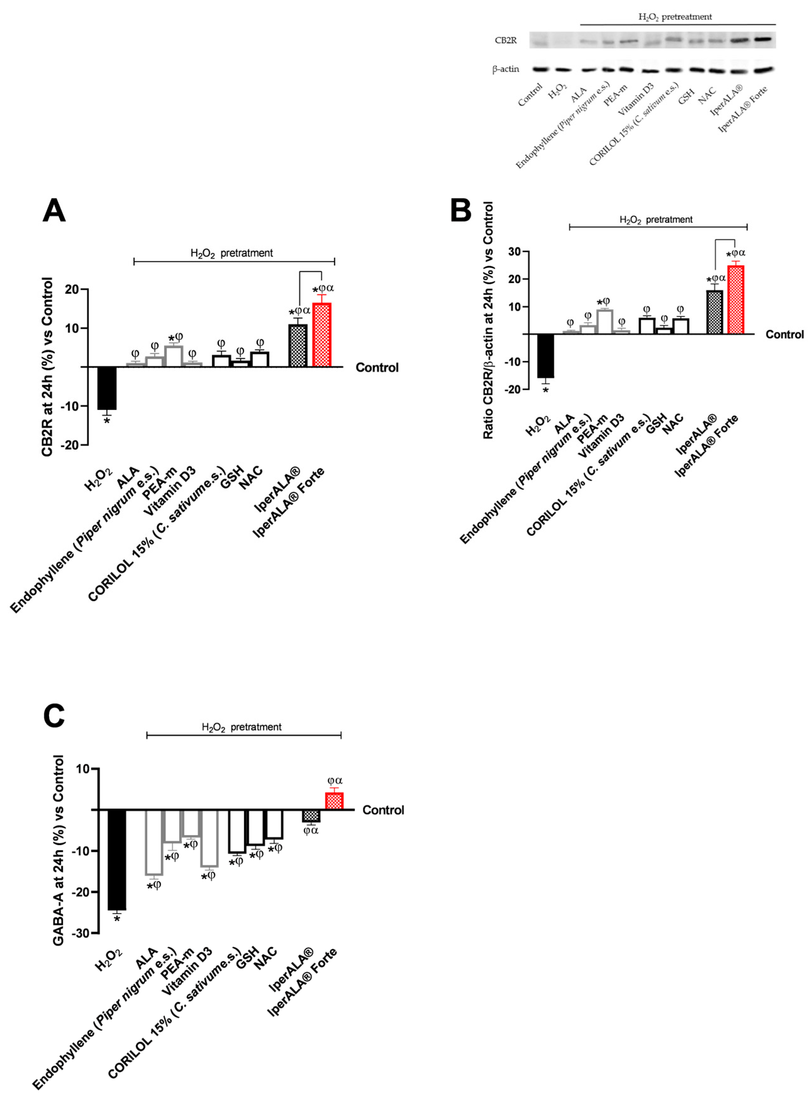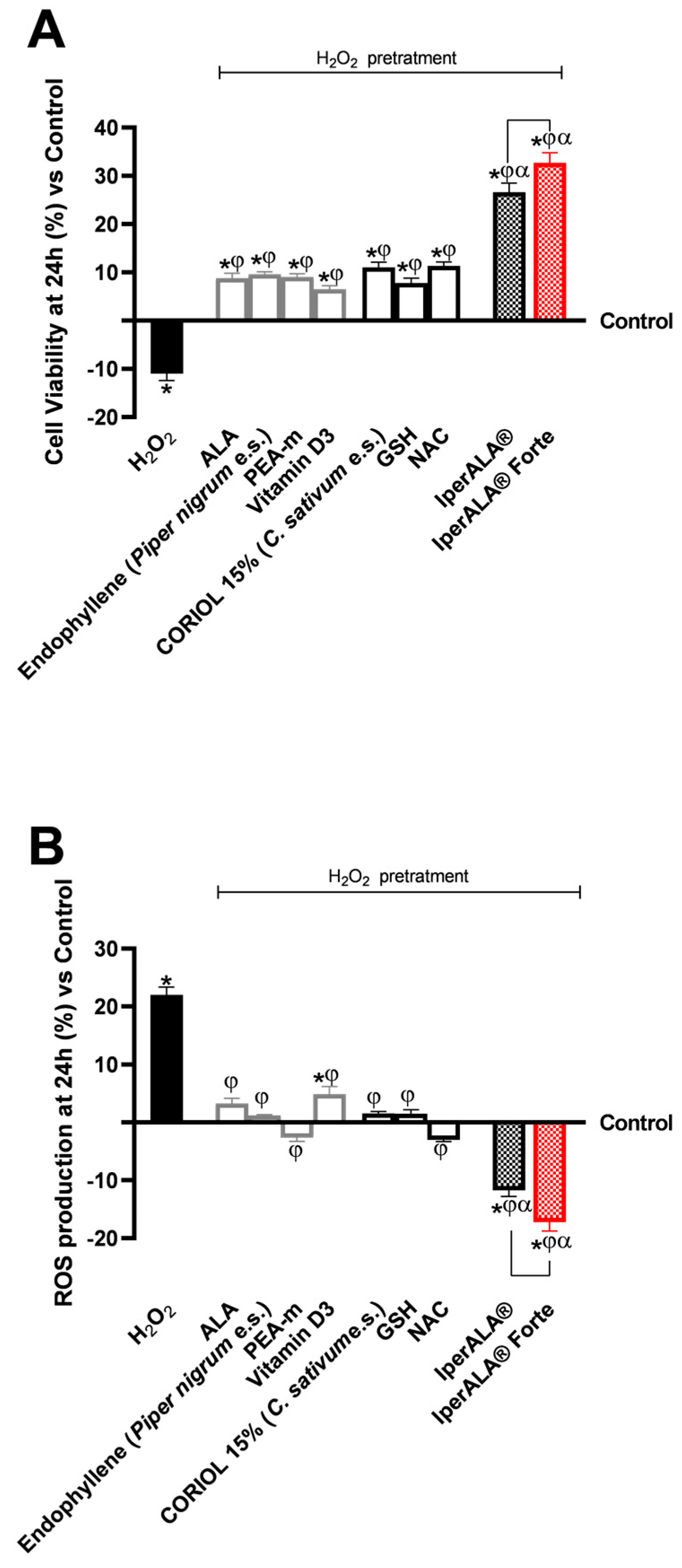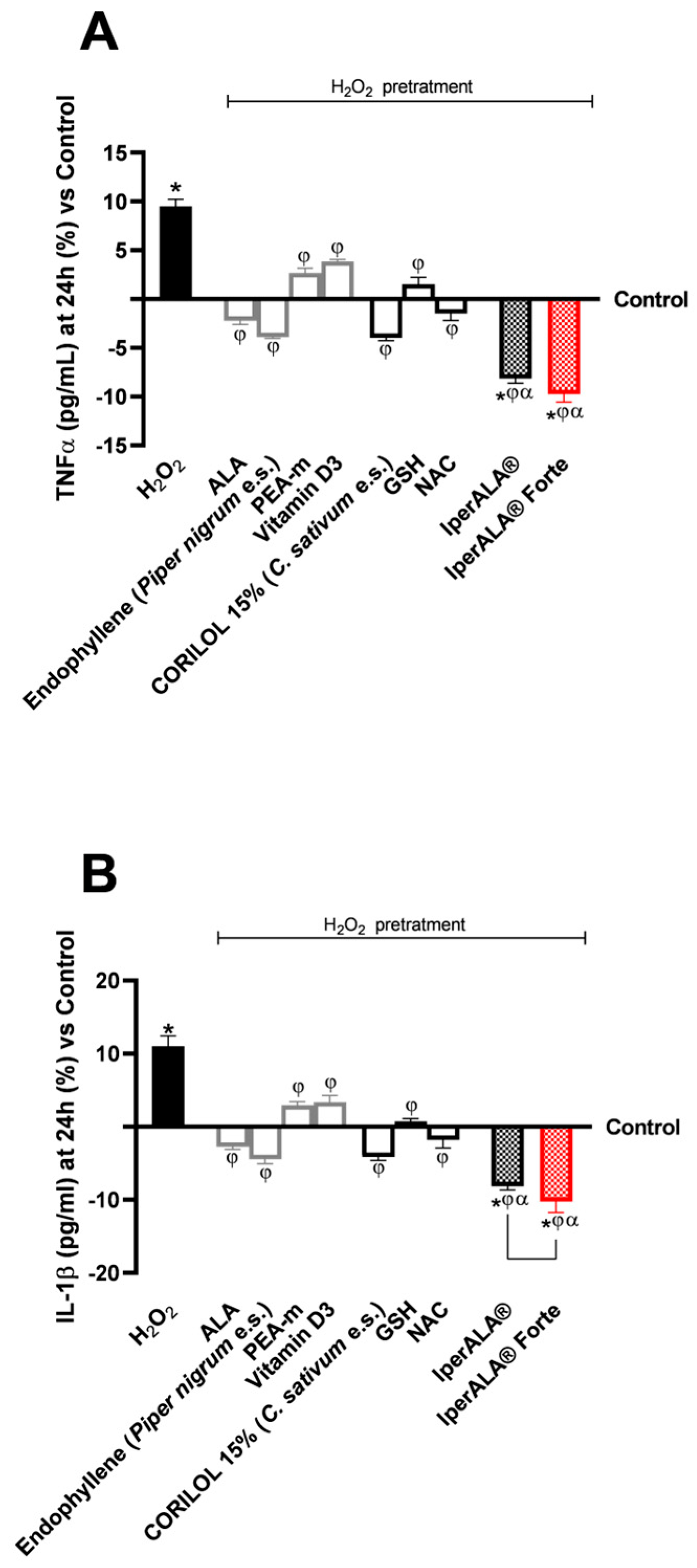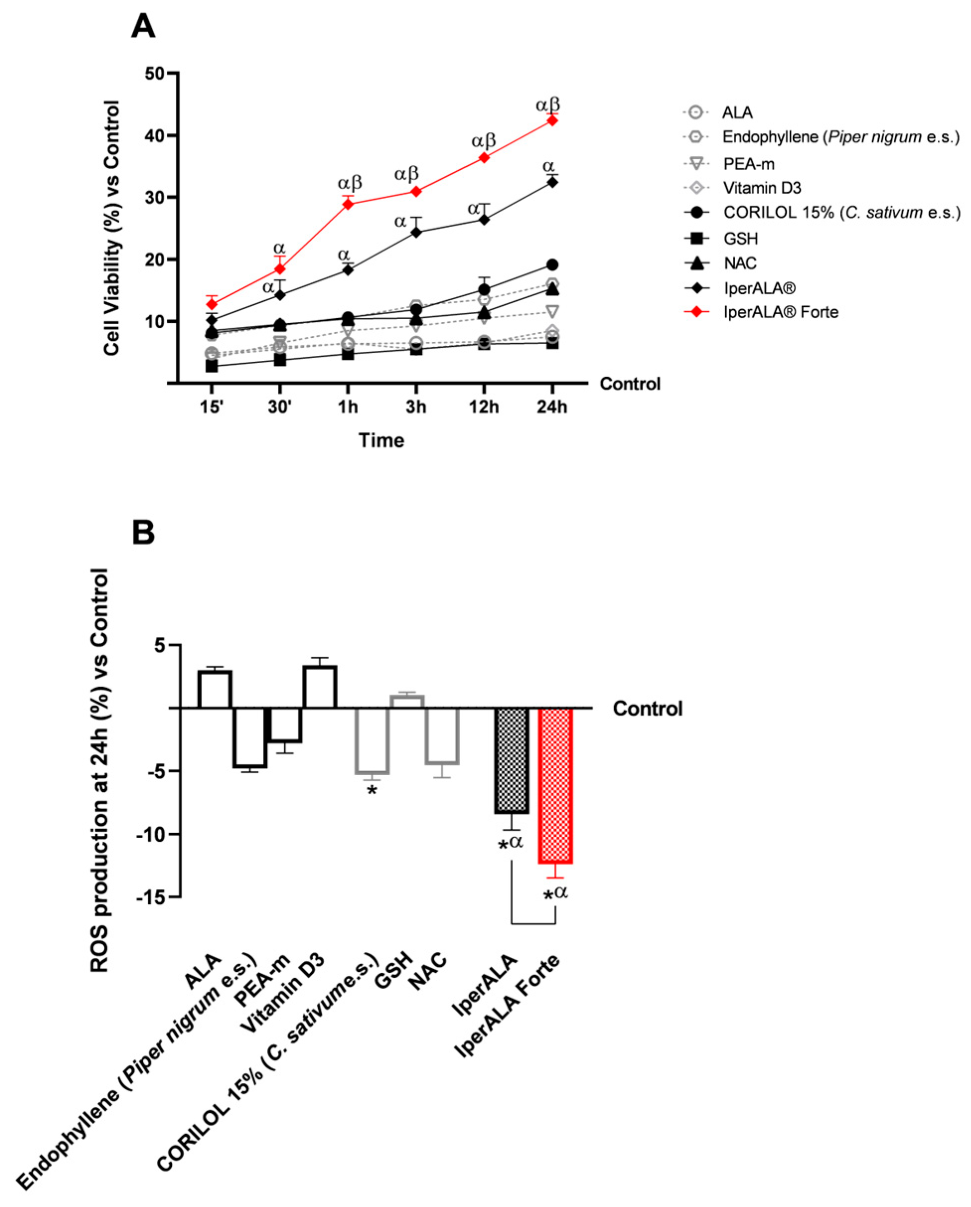 - Ferrari, S.; Mulè, S.; Galla, R.; Brovero, A.; Genovese, G.; Molinari, C.; Uberti, F. Effects of Nutraceutical Compositions Containing Rhizoma Gastrodiae or Lipoic Acid in an In Vitro Induced Neuropathic Pain Model. Int. J. Mol. Sci. 2024, 25, 2376. [Google Scholar] [CrossRef] [PubMed]