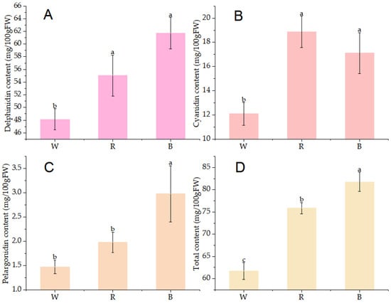 Anthocyanin content under different light qualities. (A–D) Delphinidin, cyanidin, pelargonidin, and total content. Different lowercase letters on the error bars represent significant differences (p < 0.05); The treatments with white, red, and blue light are denoted as W, R, and B, respectively.