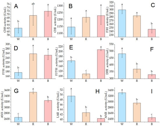 Activities of key enzymes involved in anthocyanin biosynthesis. Enzymatic activities shown are: (A) CHS, chalcone synthase; (B) CHI, chalcone isomerase; (C) F3H, flavone 3-hydroxylase; (D) F3′H, flavonoid 3′-hydroxylase; (E) F3′5′H, flavonoid 3′,5′-hydroxylase; (F) DFR, dihydroflavonol 4-reductase; (G) LAR, leucoanthocyanidin reductase; (H) ANS, anthocyanidin synthase; (I) ANR, anthocyanidin reductase. Different lowercase letters on the error bars represent significant differences (p < 0.05); The treatments with white, red, and blue light are denoted as W, R, and B, respectively.