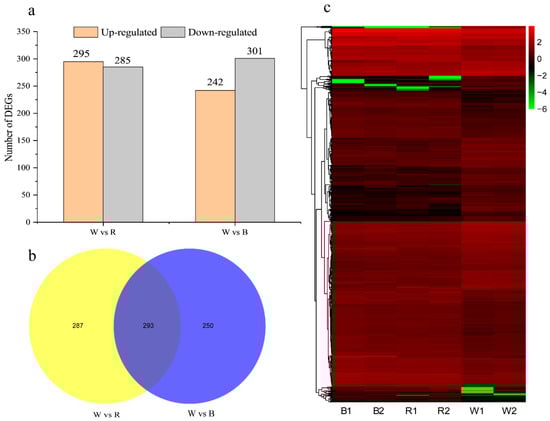 Comparative analysis between white and red light treatments revealed 580 DEGs (295 upregulated and 285 downregulated under red light), whereas the W vs. B comparison identified 543 DEGs (242 upregulated and 301 downregulated under blue light) (Figure 4a). Of these, 293 DEGs were common to both comparisons, whereas 287 and 250 DEGs were specifically identified as unique to the W vs. R and W vs. B comparisons, respectively (Figure 4b). Cluster analysis of the DEGs under the three light treatments revealed that the samples exposed to red and blue light clustered together, indicating similar gene expression profiles (Figure 4c). These findings suggest that red and blue lights exert comparable effects on the regulation of gene expression.