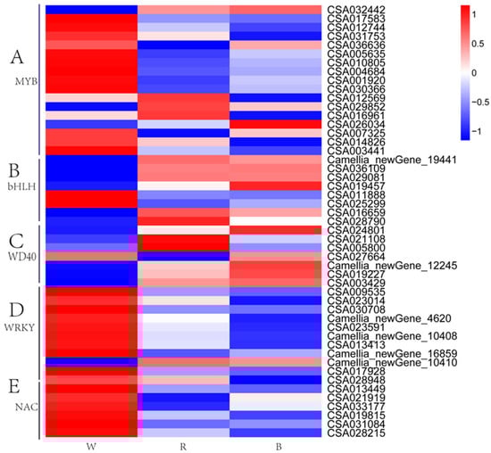 A total of 59 TFs, annotated as 27 MYBs (Figure 7A), 8 bHLHs (Figure 7B), 7 WD40s (Figure 7C), 11 WRKYs (Figure 7D), and 6 NACs (Figure 7E), were identified as potential participants in the regulation of flavonoids and anthocyanins (Figure 7). Most of these gene expression patterns were consistent under R and B treatments. Only one MYB gene (CSA032442) was significantly upregulated, whereas three (CSA017583, CSA012744, and CSA030366) were downregulated in the W vs. B group. In addition, five MYBs (CSA017583, CSA005635, CSA010805, CSA004684, and CSA001920) showed decreased expression in the W vs. R group. Regarding the bHLH family, most genes were repressed under white light; however, they were notably upregulated in the B treatment, including Camellia_newGene_19441, CSA036109, CSA029081, and CSA019457. Compared with the white light control, nearly all WD40 genes displayed higher expression levels under both red and blue light treatments. Furthermore, the expression patterns of the WRKY and NAC transcription factor families indicate their participation in the complex regulatory network governing anthocyanin biosynthesis. Although tea shoots exhibited high anthocyanin concentrations following red and blue light treatments, most WRKY genes were downregulated. These findings suggest that the aforementioned transcription factors may play crucial roles in modulating anthocyanin synthesis in purple-leaf tea plants exposed to varying light qualities.