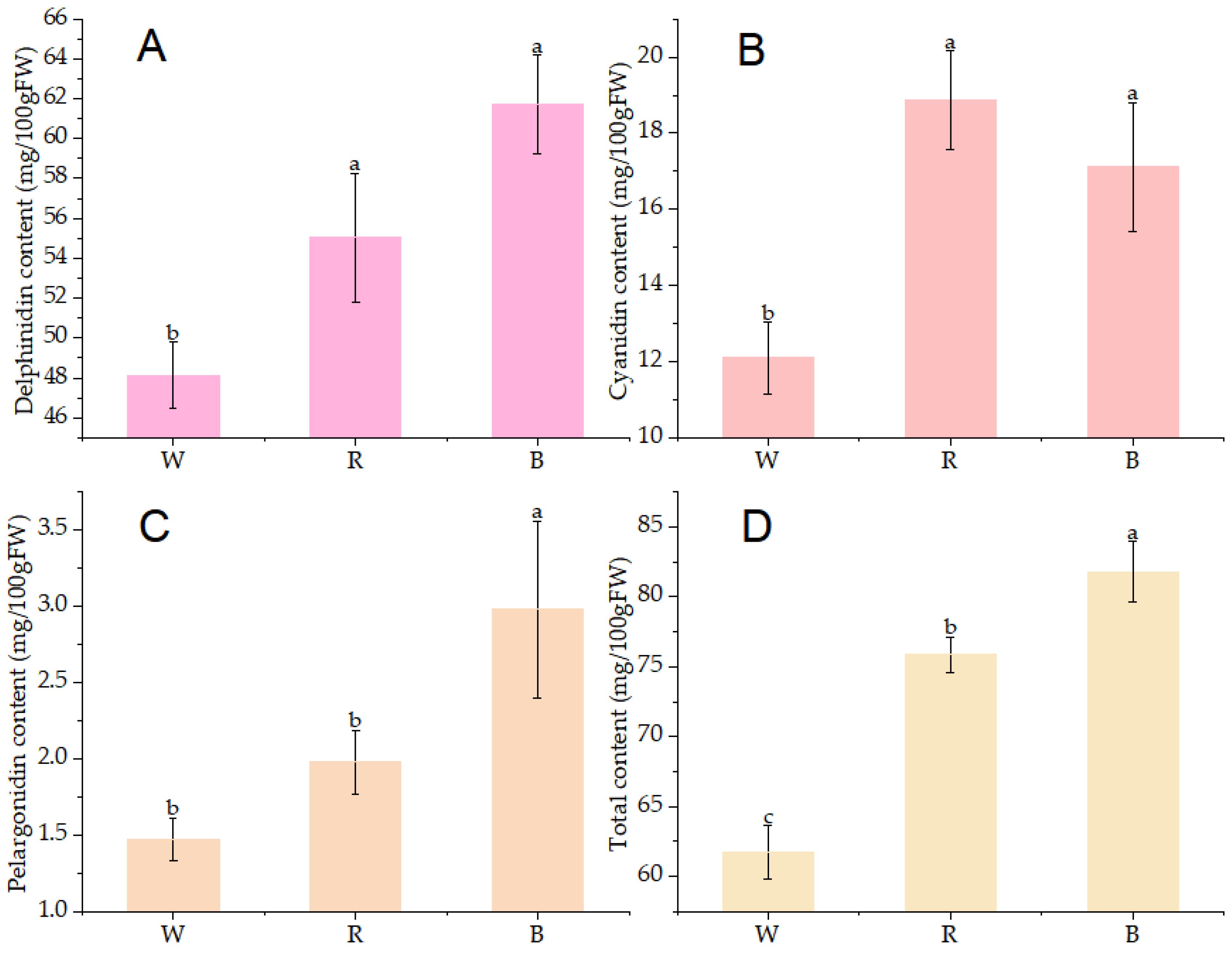 - Zoratti, L.; Sarala, M.; Carvalho, E.; Karppinen, K.; Martens, S.; Giongo, L.; Haggman, H.; Jaakola, L. Monochromatic light increases anthocyanin content during fruit development in bilberry. BMC Plant Biol. 2014, 14, 377. [Google Scholar] [CrossRef] [PubMed]