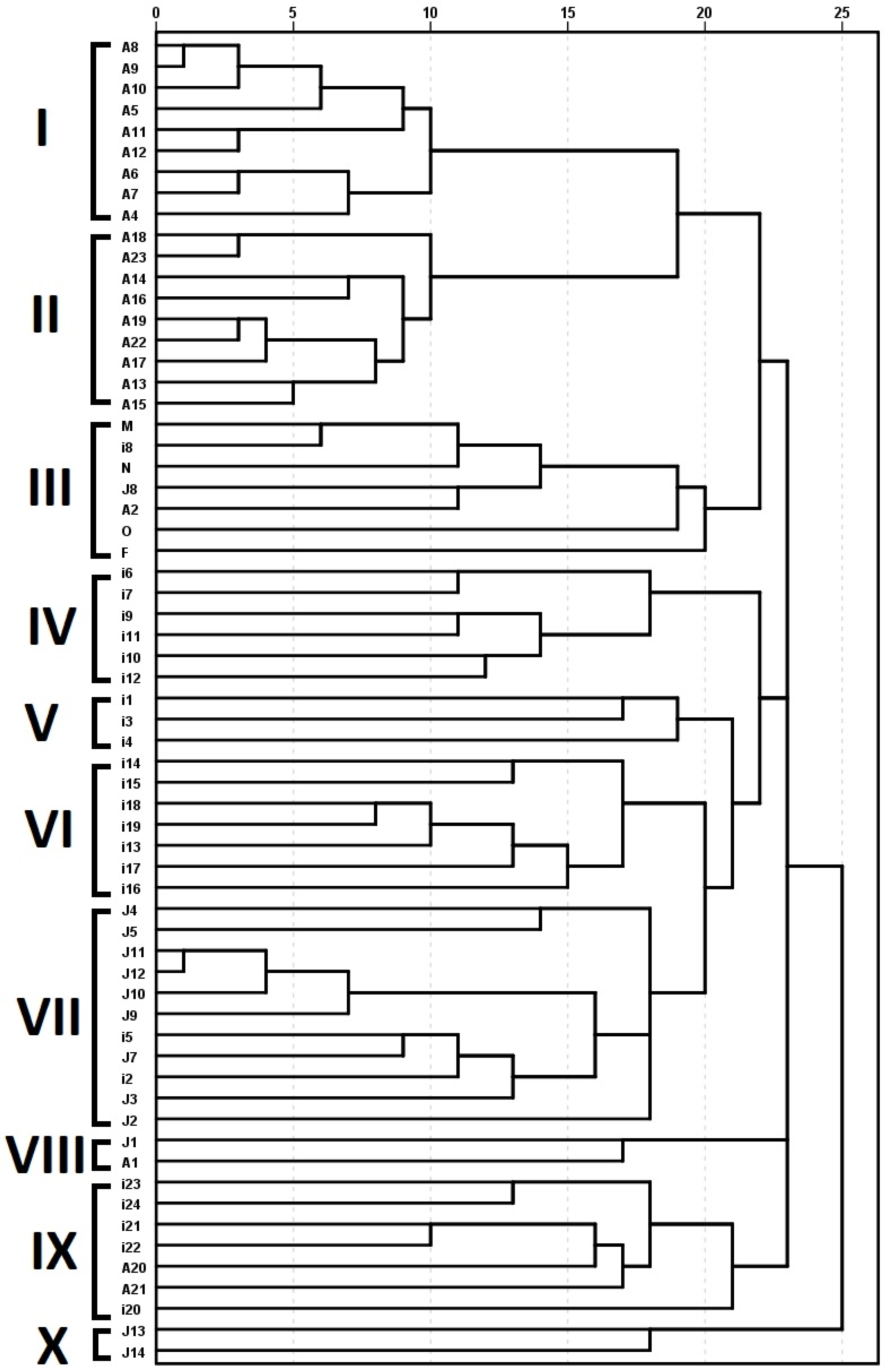 - Tessier, C.; David, J.; This, P.; Boursiquot, J.M.; Charrier, A. Optimization of the choice of molecular markers for varietal identification in Vitis vinifera L. Theor. Appl. Genet. 1999, 98, 171–177. [Google Scholar] [CrossRef]