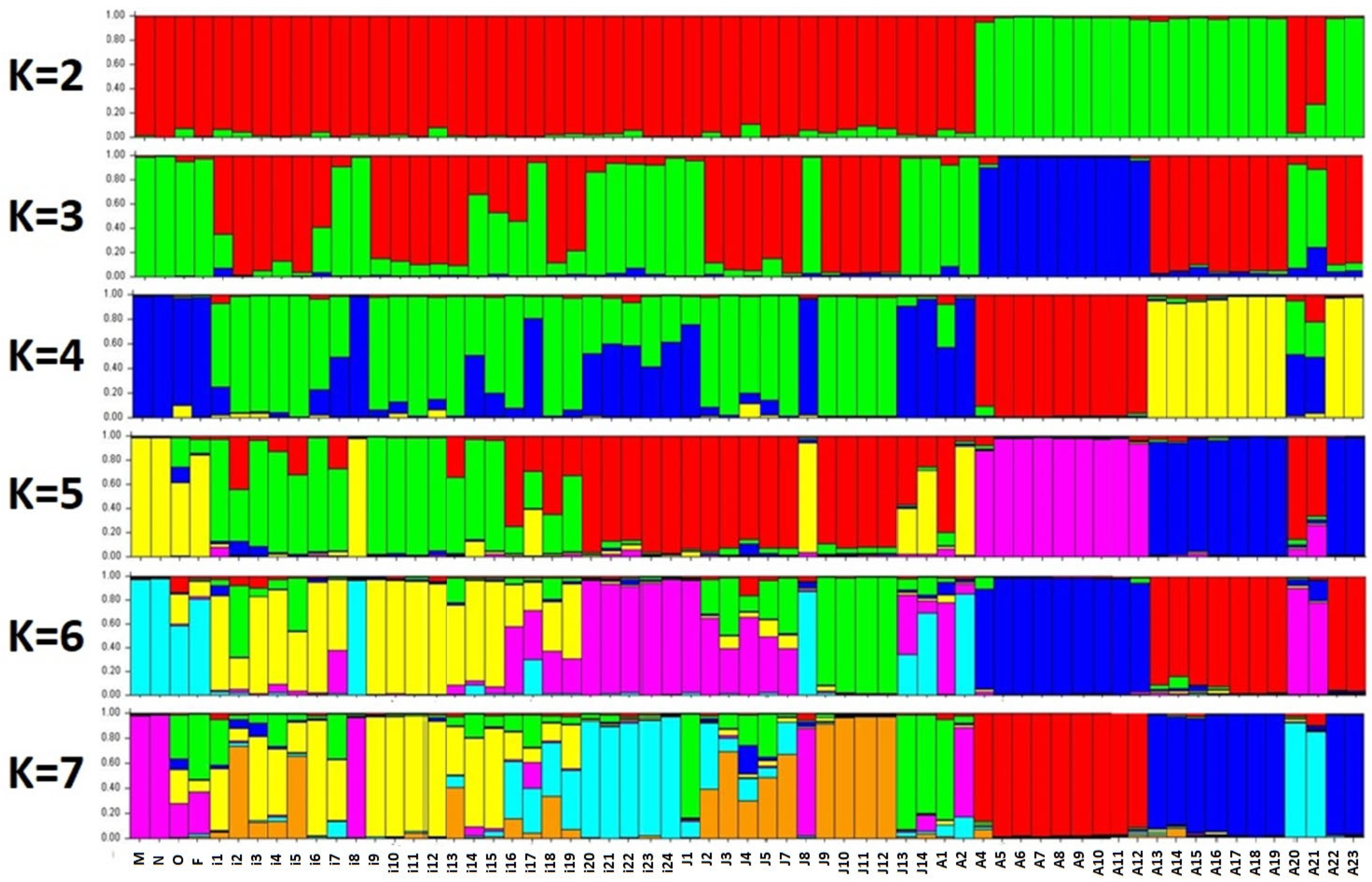 - Pritchard, J.K.; Wen, X.; Falush, D. Documentation for Structure Software: Version 2.3; University of Chicago: Chicago, IL, USA, 2010; Volume 1, p. 37. [Google Scholar]