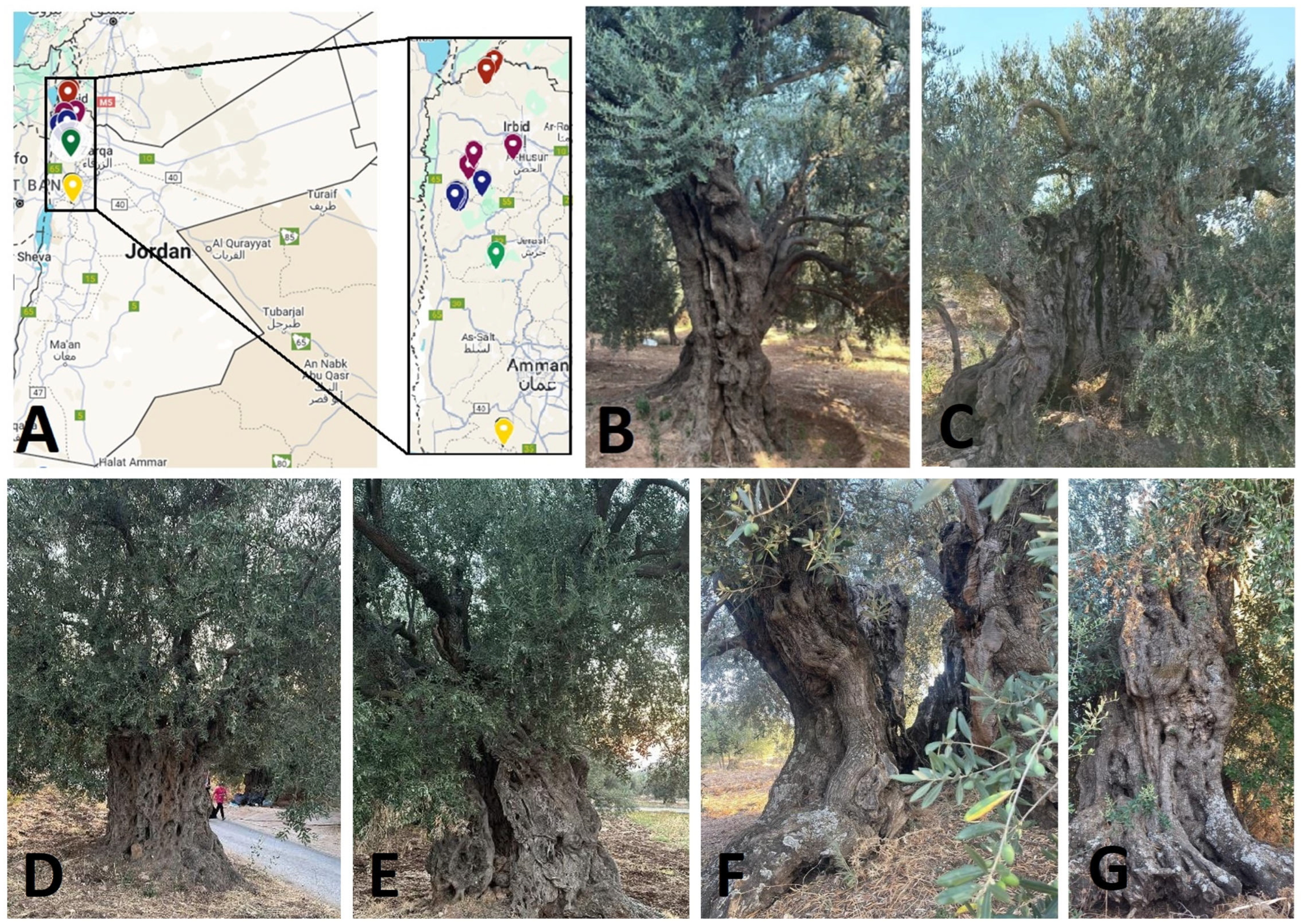 - Al-Maaitah, M.; Al-Shdiefat, S.; Ayoub, S.; Al-Batsh, J.; Kattan, U.; Al-Julani, E. Jordan, where olive trees grew long before the advent of civilization. Olivae 2022, 129. Available online: https://www.internationaloliveoil.org/product/olivae-129-english-edition/ (accessed on 6 November 2025).