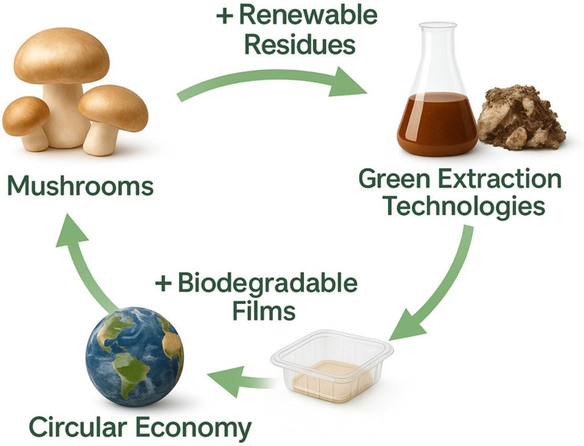 The mushroom industry generates a substantial amount of residues each year, encompassing materials such as processing residues and spent substrates. Much of this biomass is discarded, despite its richness in valuable compounds. Mushroom residues contain bioactive substances including β-glucans, phenolic compounds, proteins, and dietary fiber, all of which are well known for their antioxidant and antimicrobial properties. While fruit and vegetable residues have been extensively explored as raw materials for eco-friendly packaging, mushroom-derived residues remain a largely underutilized resource. Recent studies have highlighted their potential as a renewable source of functional ingredients for sustainable food packaging. By applying green extraction technologies such as ultrasound- or microwave-assisted methods, researchers can recover stable bioactive compounds and incorporate them into biodegradable polymers. Early results are promising: packaging films enriched with mushroom residue extracts demonstrate improved mechanical strength, enhanced barrier properties, and added bioactivity. This strategy aligns with the principles of the Circular Economy, simultaneously reducing environmental impact and adding value to materials that were previously discarded. Although further optimization is needed, particularly regarding extraction efficiency, compound stability, and scalability, the valorization of mushroom residues represents a promising pathway toward the next generation of sustainable, eco-friendly packaging materials.