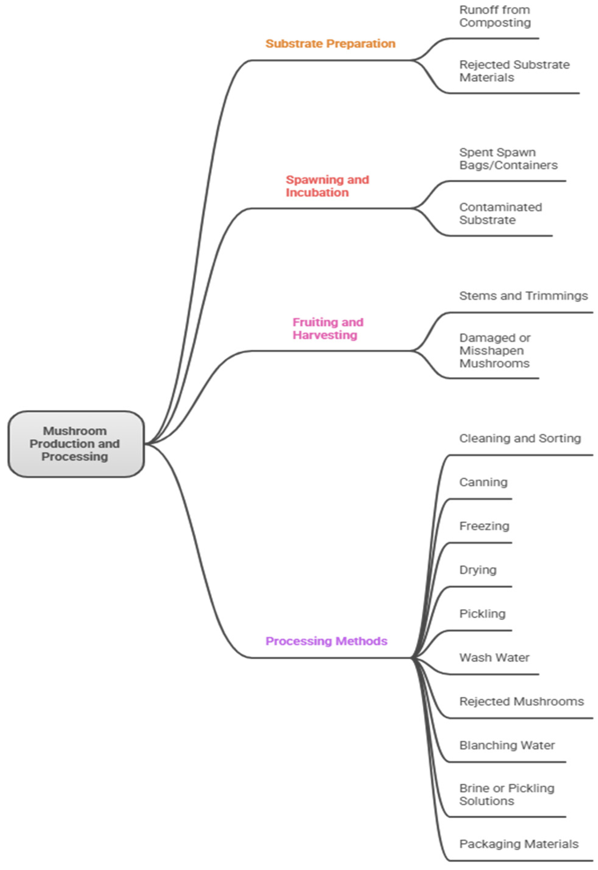 • Trimming residues—Discarded stipes (stems), caps, and misshapen or undersized mushrooms, often from quality control during harvesting and packaging, representing 5–10% of fresh yield.