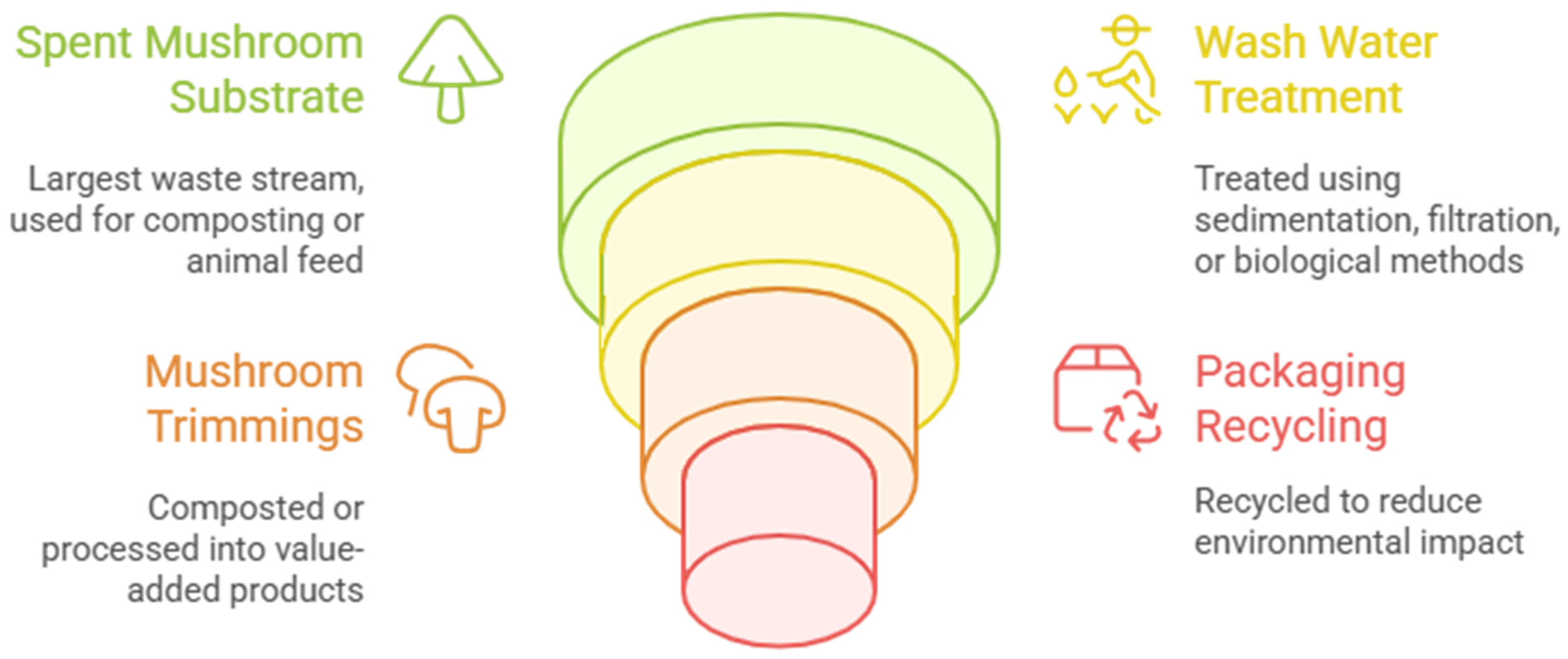 Figure 2. Circular valorization pathways of mushroom industry residues, highlighting the reuse of spent mushroom substrate, mushroom trimmings, wash water, and packaging materials through composting, recycling, and treatment processes.