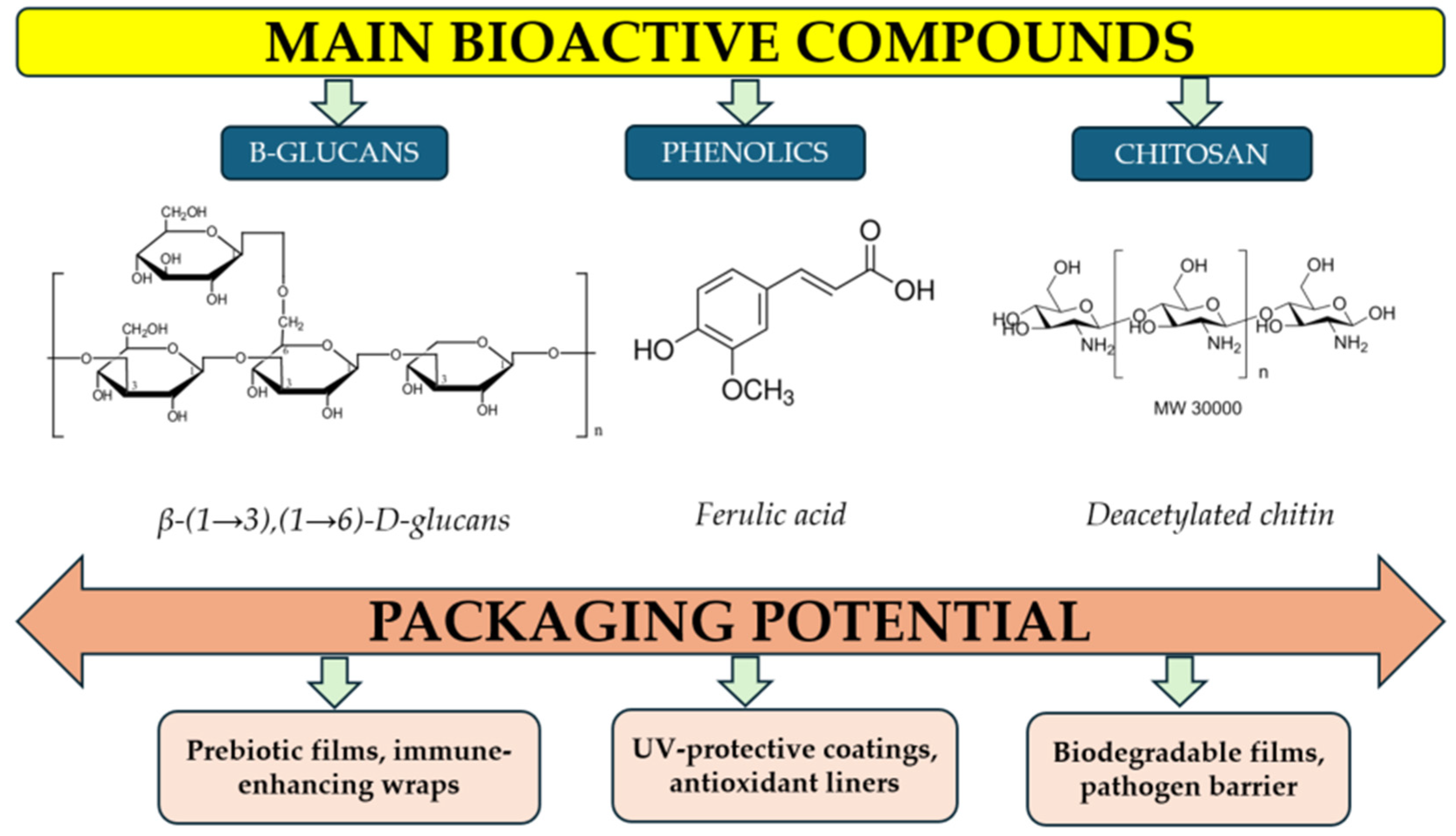 Notably, mushroom residues are rich in bioactive compounds, including β-glucans, phenolics, proteins, chitin, and dietary fibers. These components are known for their antioxidant, antimicrobial, and health-promoting effects [12,14], and can enhance the functionality of biodegradable packaging. For example, β-glucans offer immunomodulatory and antioxidant benefits [15], phenolic compounds protect against oxidation, and proteins can improve the structural integrity of polymer films [16]. Together, these features make mushroom residues a promising source for active packaging solutions that can reduce environmental impact while maintaining food quality.